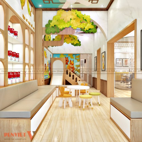 Không gian khu vực vui chơi của trẻ nhỏ được bố trí ngay lối ra vào song song với sảnh lễ tân. Phòng khám phục vụ chủ yếu là các bạn nhỏ nên đây là nơi để các bé thoải mái vui đùa sau hay trước khám bệnh. Sự tinh tế của chủ đầu tư sẽ giúp phòng khám nhận được đánh giá cao của phụ huynh hay các em nhỏ khi đến thăm bệnh.