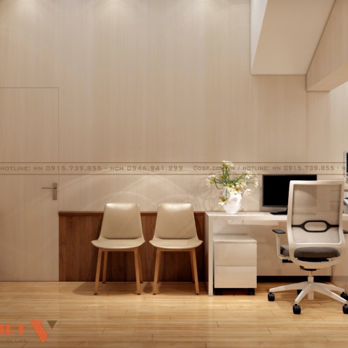 Hai phòng khám liên thông với nhau qua vách ngăn hiện đại vừa tăng sự liên kết vừa tiết kiệm không gian nhưng vẫn đảm bảo sự riêng tư. Đồ nội thất chất lượng cao cấp, tuổi thọ lâu dài giúp chủ đầu tư tối ưu chi phí.