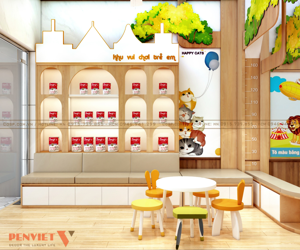 Phía bên trái là lối thông sang khu vực vui chơi của trẻ nhỏ bên cạnh. PenViet sử dụng các chi tiết trang trí đẹp mắt trên diện tường khu vực này khiến tổng thể không gian thêm ấn tượng.