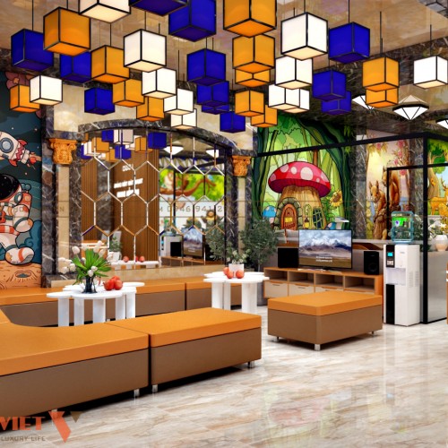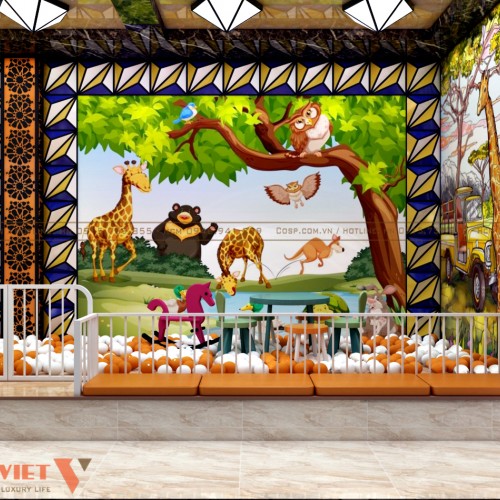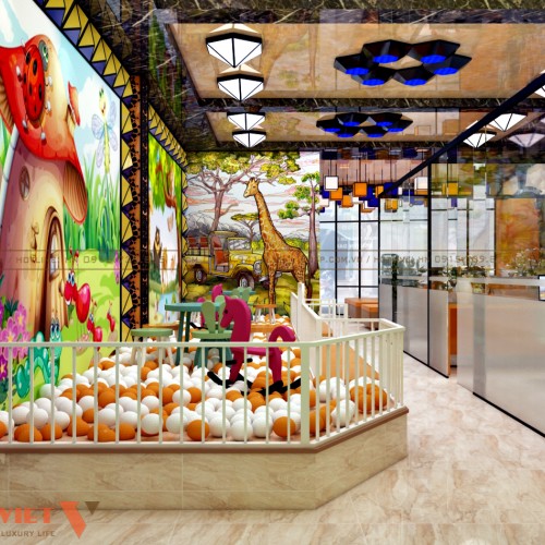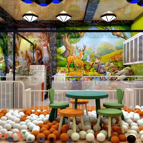 Khu vui chơi có setup bàn ghế xinh xắn phục vụ các bạn nhỏ