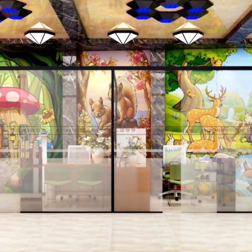 Phía diện tường ngay chỗ ghế ngồi được PenViet trang trí vô cùng bắt mắt với các họa tiết dễ thương. Ngoài ra còn có vách gương hình quả trám với hiệu ứng nới rộng không gian hiệu quả. Họa tiết độc đáo, đẹp mắt sẽ thu hút các bạn nhỏ đến tiêm phòng, để giảm thiểu nỗi lo lắng và sợ hãi cho các bé.