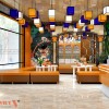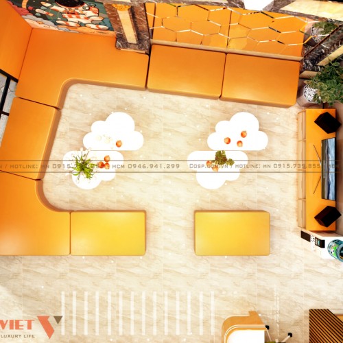 Góc trái cửa ra vào chính là khu vực ngồi chờ của khách hàng trước và sau tiêm phòng. Ghế ngồi là dãy ghế sofa màu cam được ghép lại thành hình chữ U, ở giữa có các bàn trà nhỏ xinh nhằm đáp ứng số lượng khách hàng đông đảo đến trải nghiệm dịch vụ.