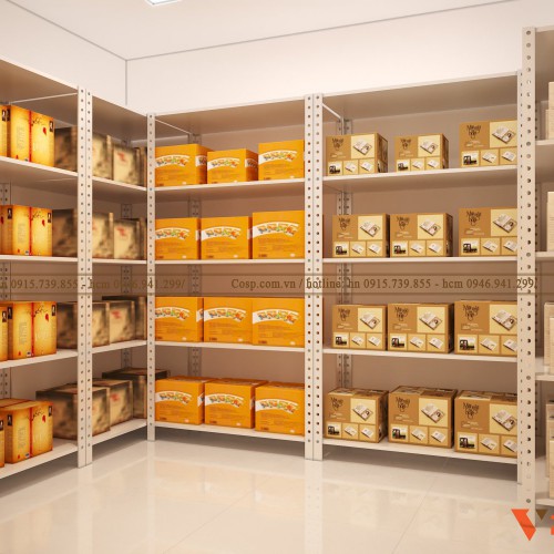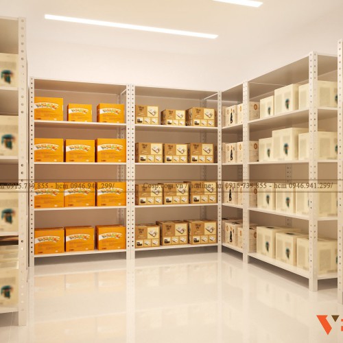 Với kiểu dáng nhỏ gọn cùng chất liệu khung sắt kết hợp các đợt tôn chắc chắn, các kệ thuốc được bài trí vuông góc dọc sát tường để tạo không gian đi lại rộng rãi. Bởi các sản phẩm thuốc có trọng lượng không quá lớn, bởi vậy, chúng tôi đã sử dụng các kệ nhỏ gọn nhưng vẫn đảm bảo tính thẩm mỹ và phù hợp với công năng sử dụng.