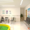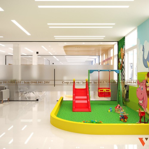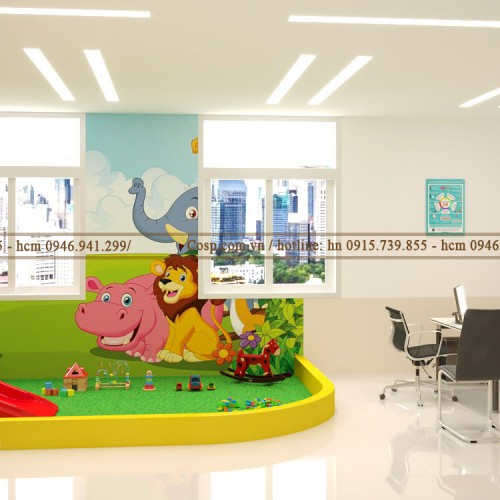 Với sự sáng tạo cùng kinh nghiệm trong lĩnh vực thiết kế thi công nội thất, các kiến trúc sư đã thiết kế khu vui chơi trẻ em vô cùng sinh động và phù hợp với tổng thể của dự án. Phần tường được chúng tôi sử dụng tranh backlist với các nhân vật hoạt hình ngộ nghĩnh, gần gũi với trẻ em. Xung quanh sàn được trải thảm cỏ êm ái và đi viền bục gỗ màu vàng để tạo sự ngăn cách với các khu vực khác trong phòng khám.
