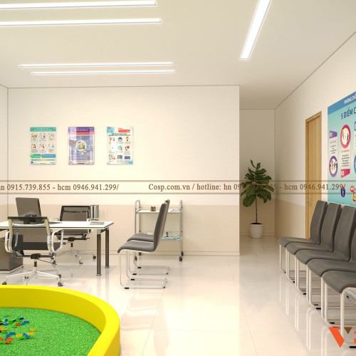 Hiện nay, với nhu cầu tiêm chủng cho con em của mình ngày một nhiều tại các phòng khám tư, bệnh viện đa khoa Trí Đức Thành đã bố trí khu vực tư vấn tiêm chủng cùng với khu vui chơi trẻ em để các em bé không sợ hãi khi đến thăm khám. Bàn làm việc của bác sĩ được thiết kế đơn giản với chân sắt sơn tĩnh điện kết hợp mặt bàn gỗ MDF chống ẩm để tạo sự gần gũi với khách hàng. Đồng thời, chúng tôi cũng bố trí dãy ghế ngồi chờ dành cho cha mẹ, người thân khi đến với Trí Đức Thành.