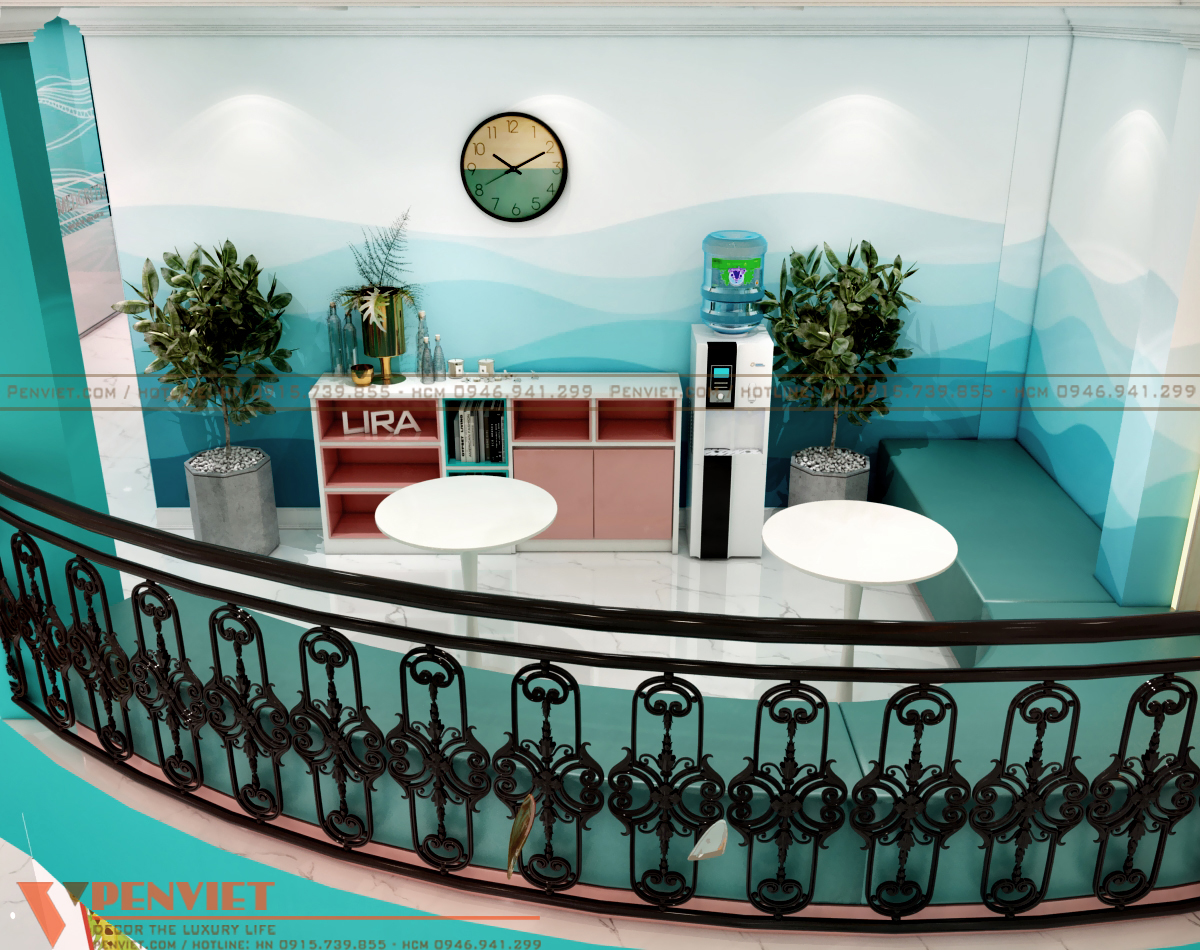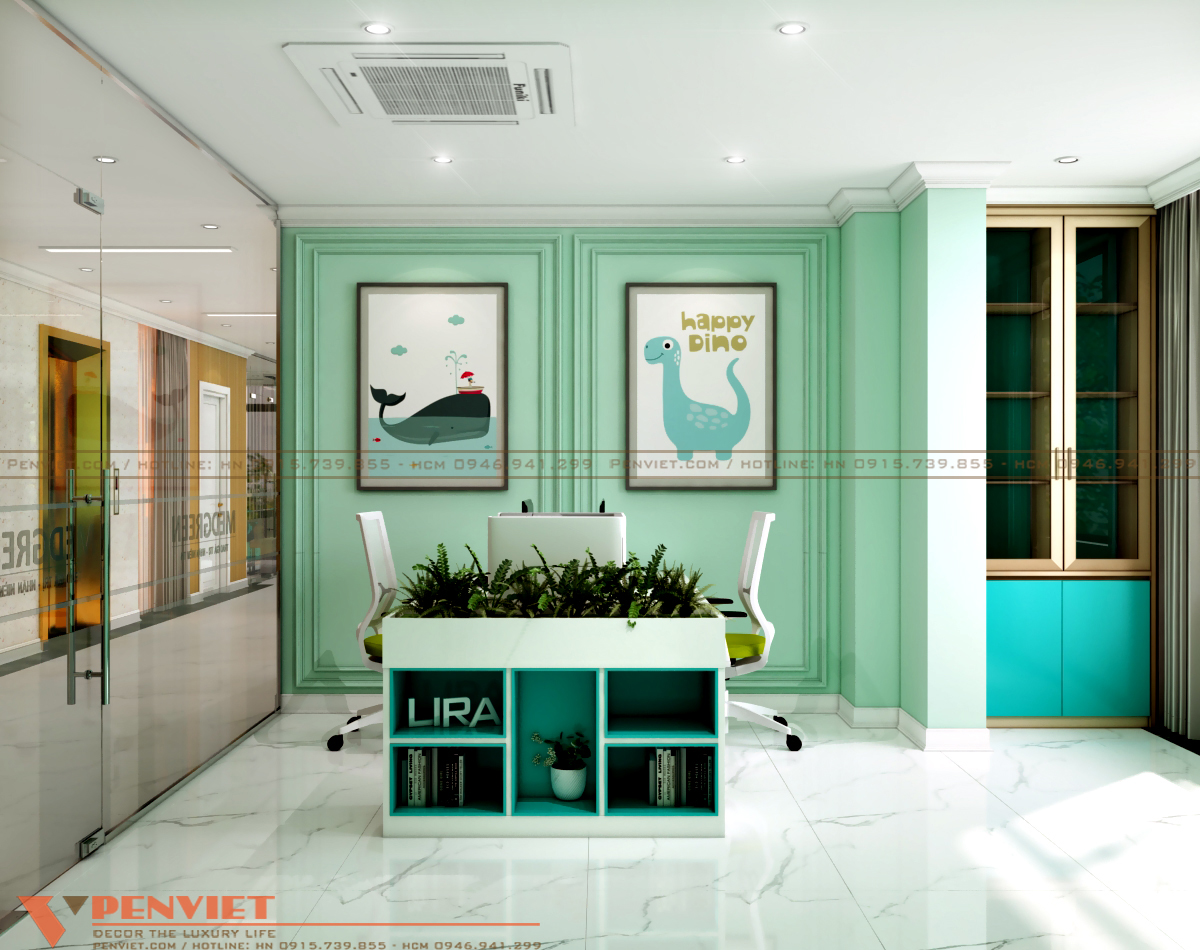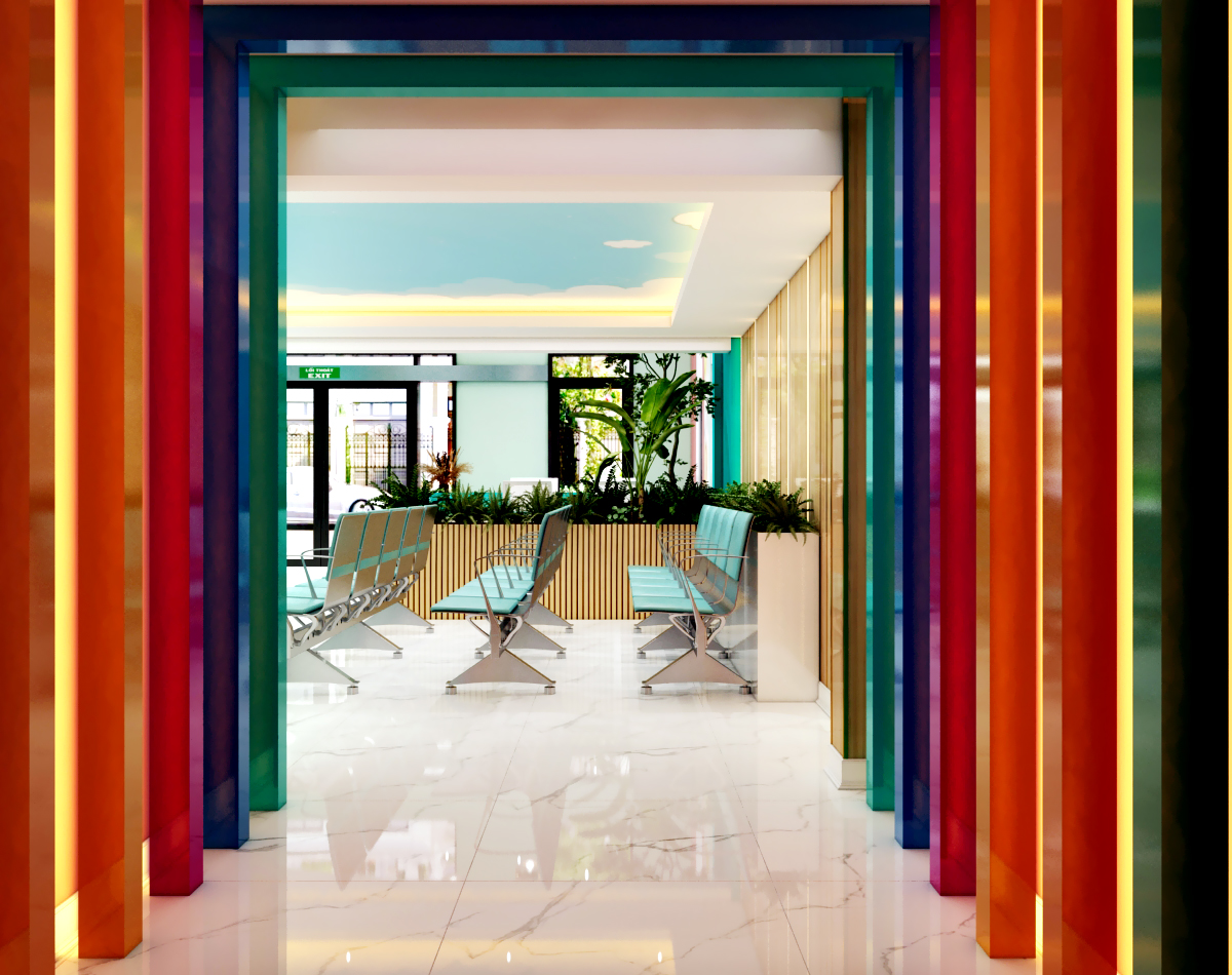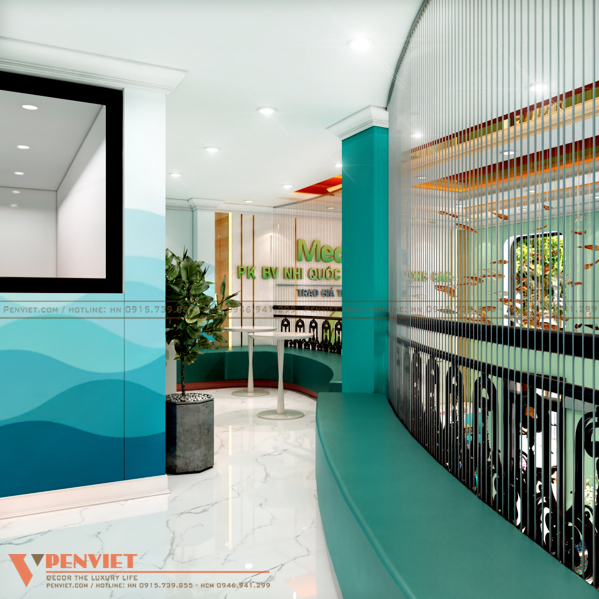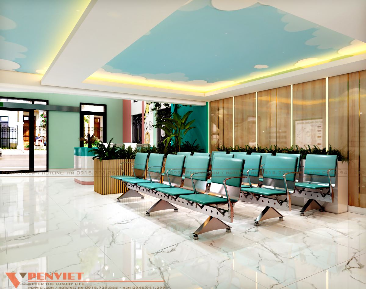 Sảnh lễ tân là nơi đón tiếp bệnh nhân và người nhà đầu tiên khi đến với phòng khám. Chính vì thế, thiết kế khu vực này không chỉ mang đến sự chuyên nghiệp, ấn tượng mà còn phải mang đến sự thoải mái cho bệnh nhân nhí.