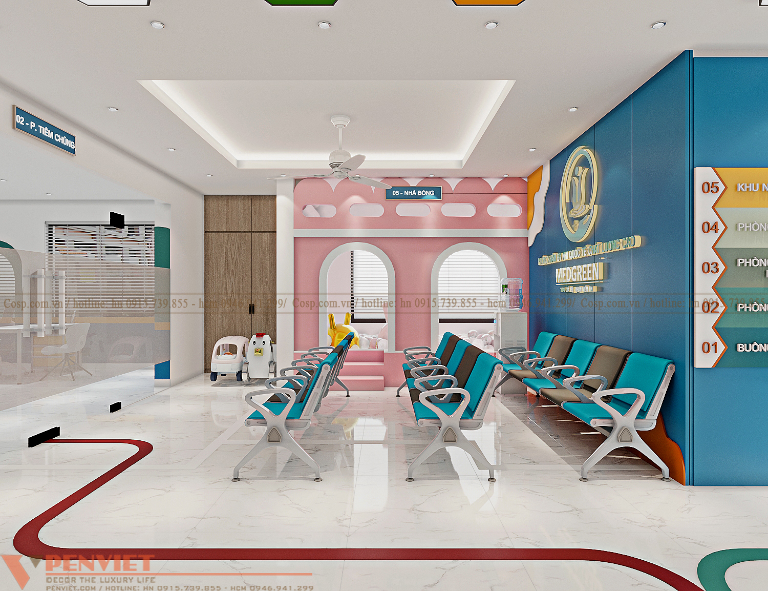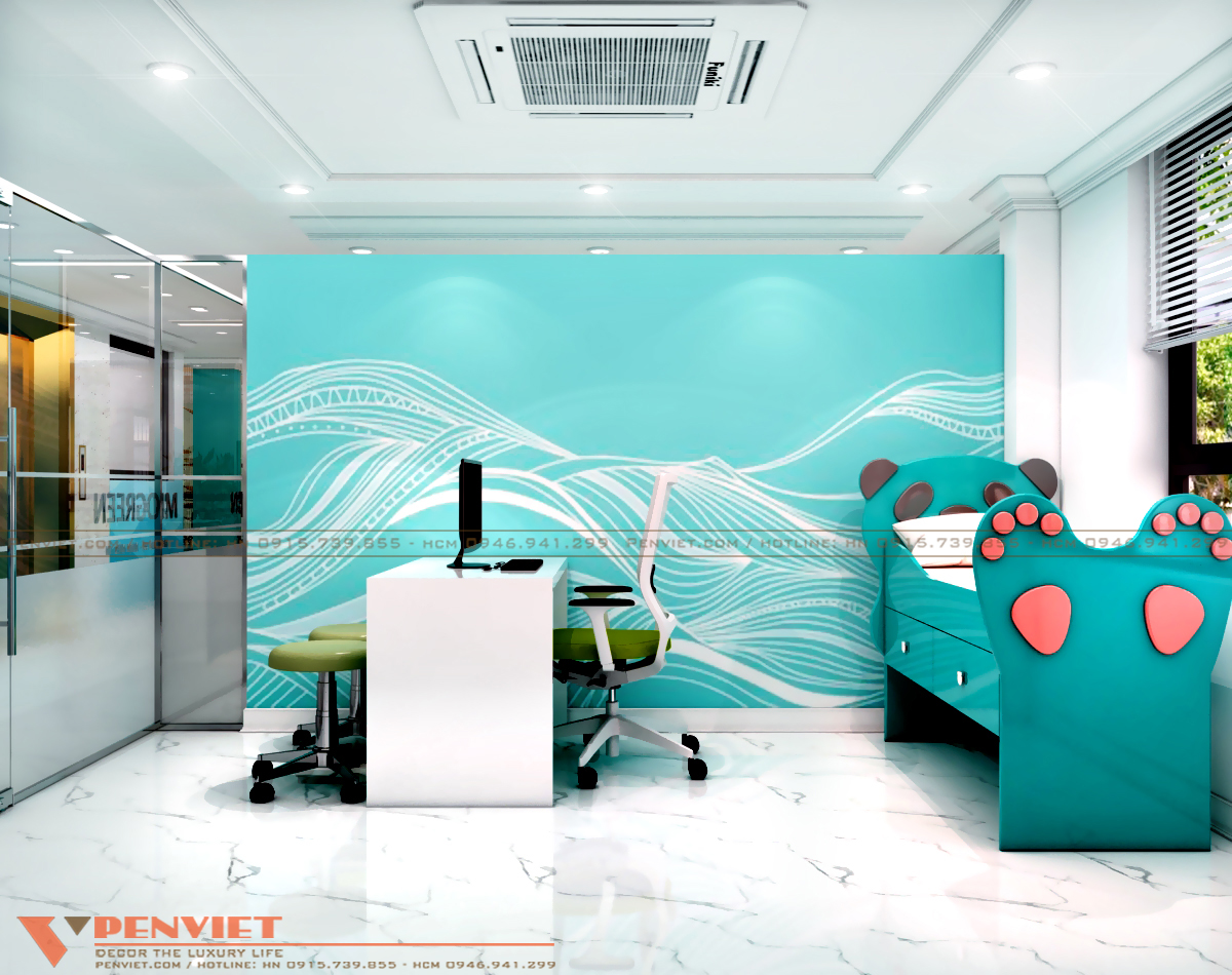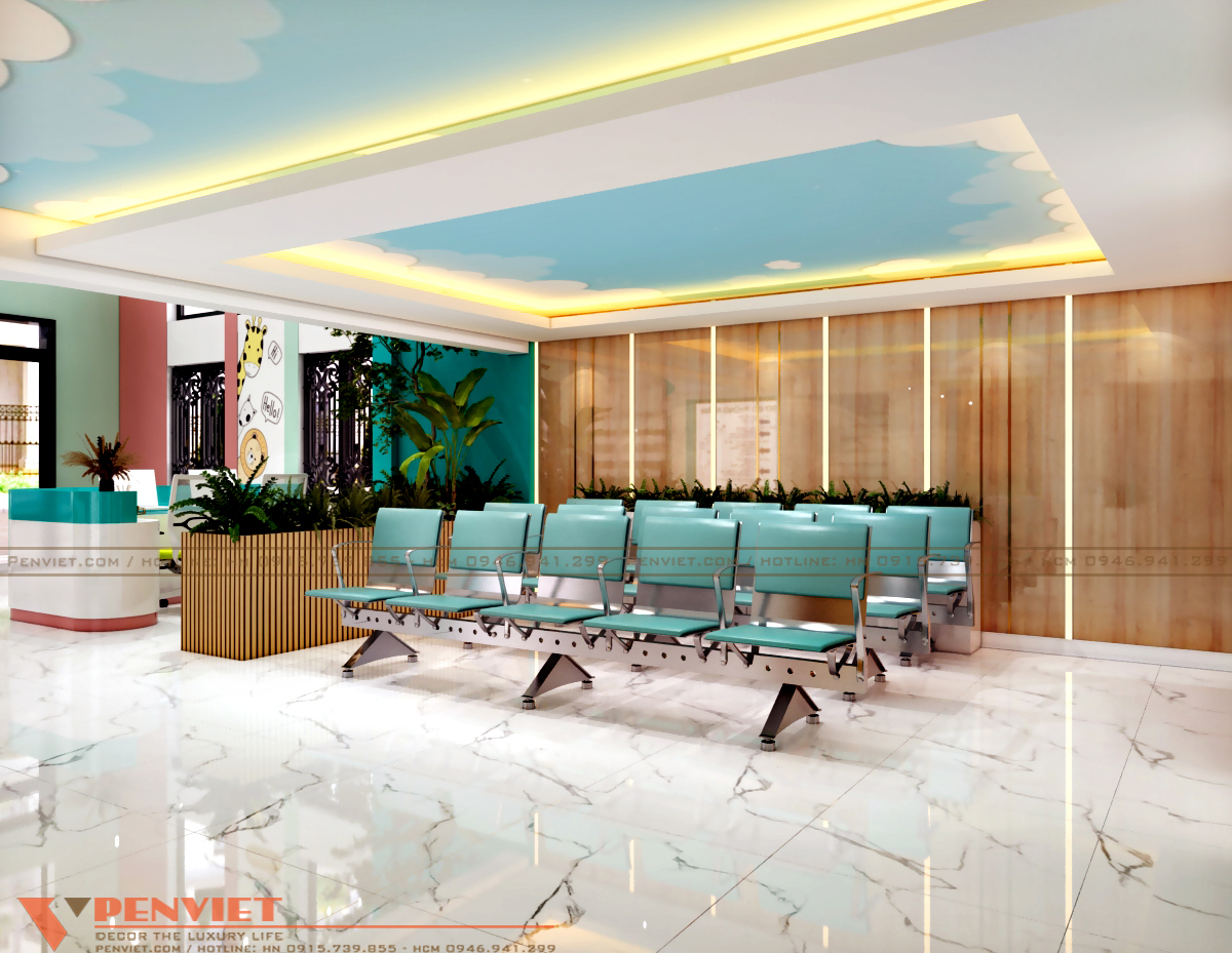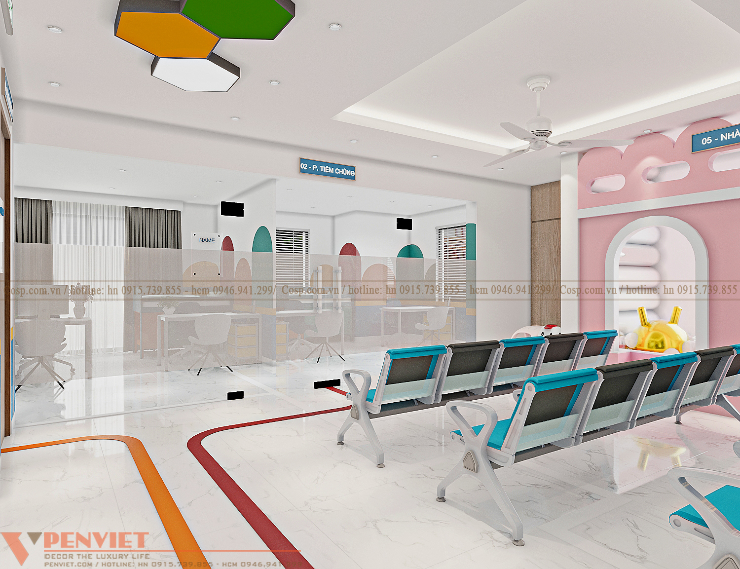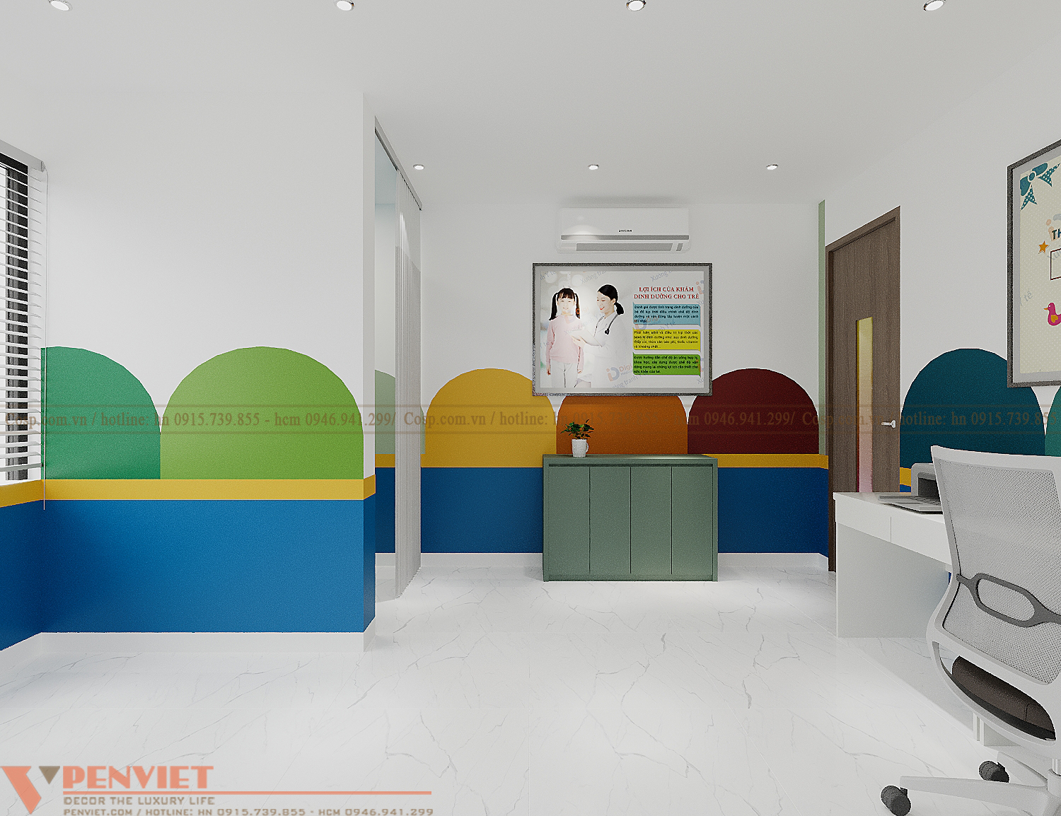 Đây là nơi thăm khám tổng quát cho bệnh nhân nhí, vì thế, đồ nội thất và trang thiết bị đặc trưng được bố trí đầy đủ, đáp ứng được mọi nhu cầu trong không gian khép kín. Bệnh nhân nhí đến khám chữa bệnh thường mang tâm lý lo sợ, e ngại. Do vậy Penviet đã lựa chọn tông màu trắng chủ đạo để không gian thông thoáng và dễ chịu, kết hợp màu sắc sinh động trang trí sẽ khơi dậy sự thích thú ở trẻ em.