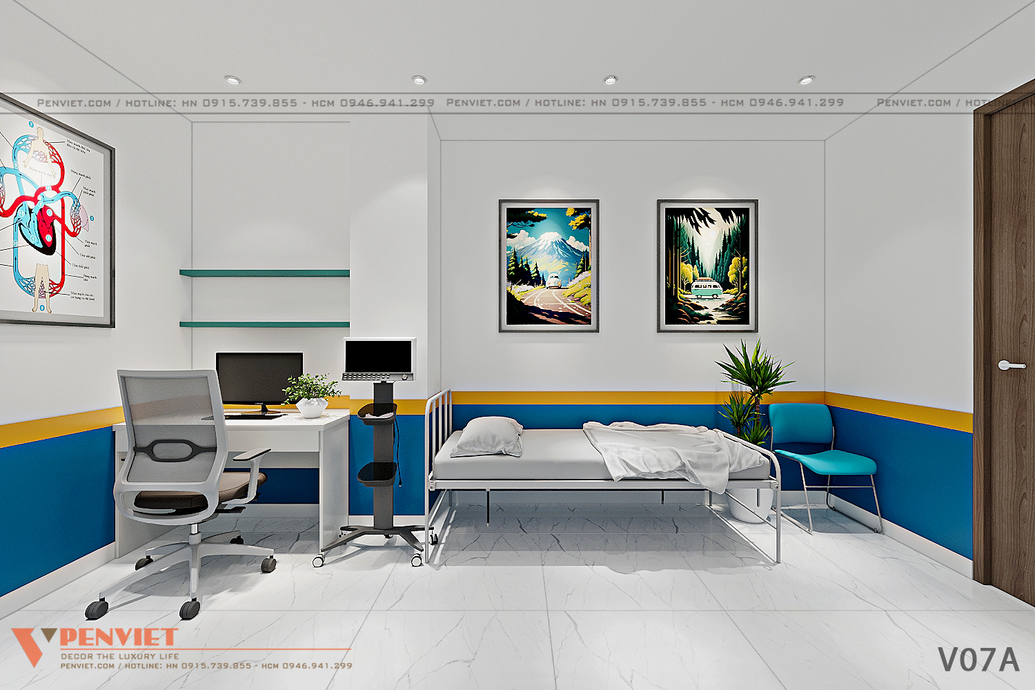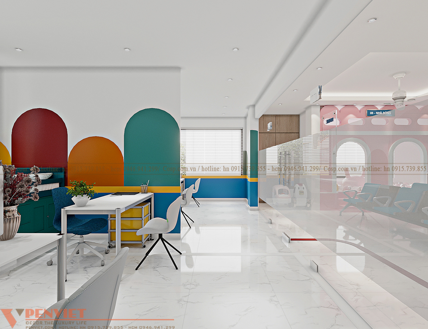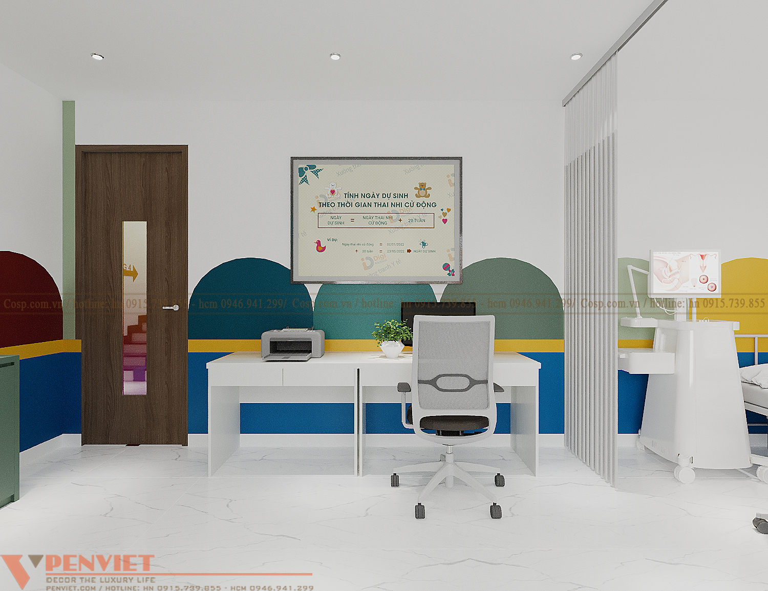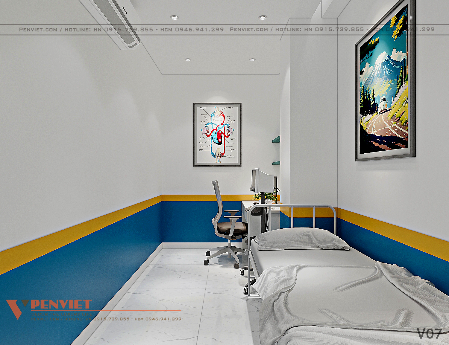 Đây là nơi thăm khám tổng quát cho bệnh nhân nhí, vì thế, đồ nội thất và trang thiết bị đặc trưng được bố trí đầy đủ, đáp ứng được mọi nhu cầu trong không gian khép kín. Bệnh nhân nhí đến khám chữa bệnh thường mang tâm lý lo sợ, e ngại. Do vậy Penviet đã lựa chọn tông màu trắng chủ đạo để không gian thông thoáng và dễ chịu, kết hợp màu sắc sinh động trang trí sẽ khơi dậy sự thích thú ở trẻ em.