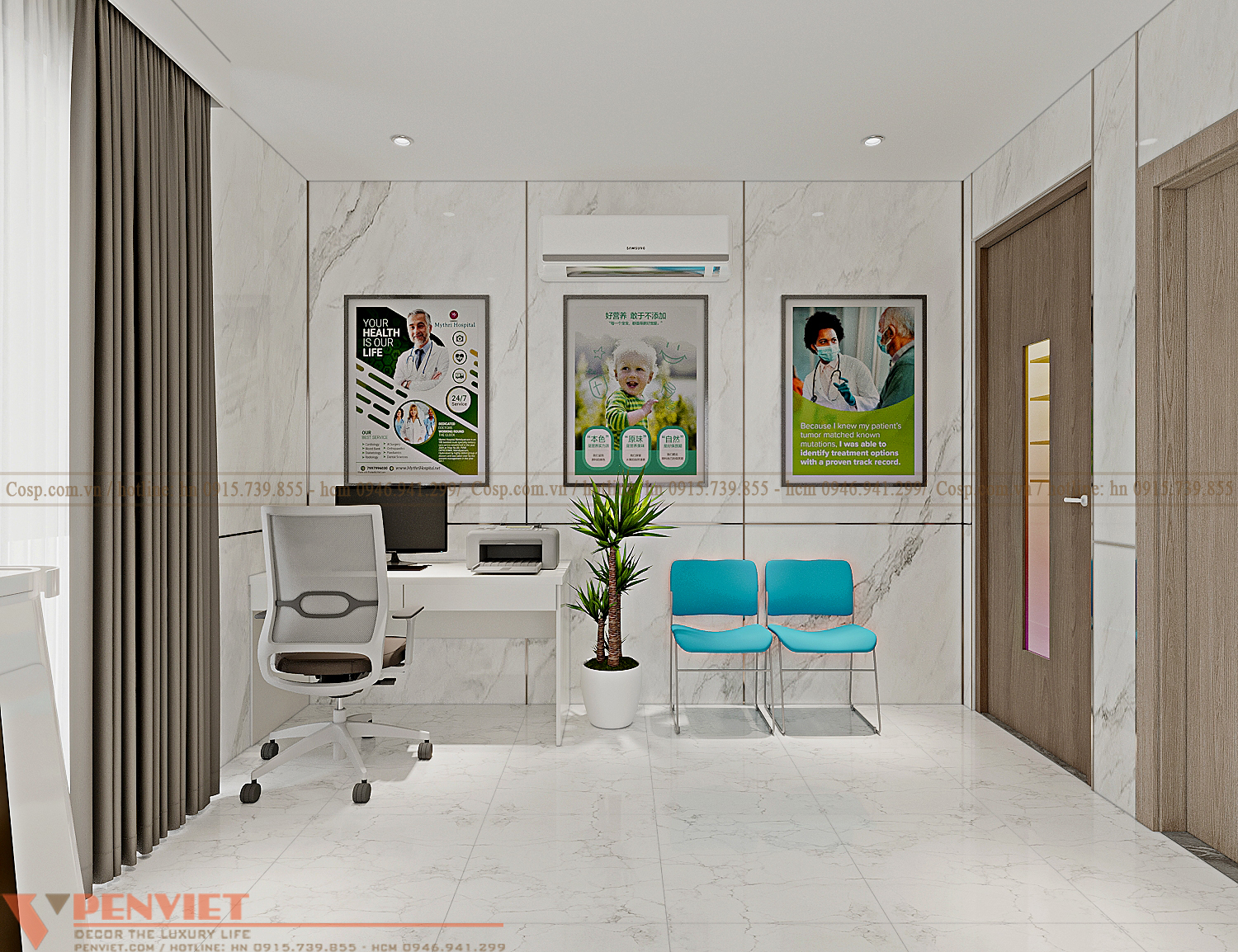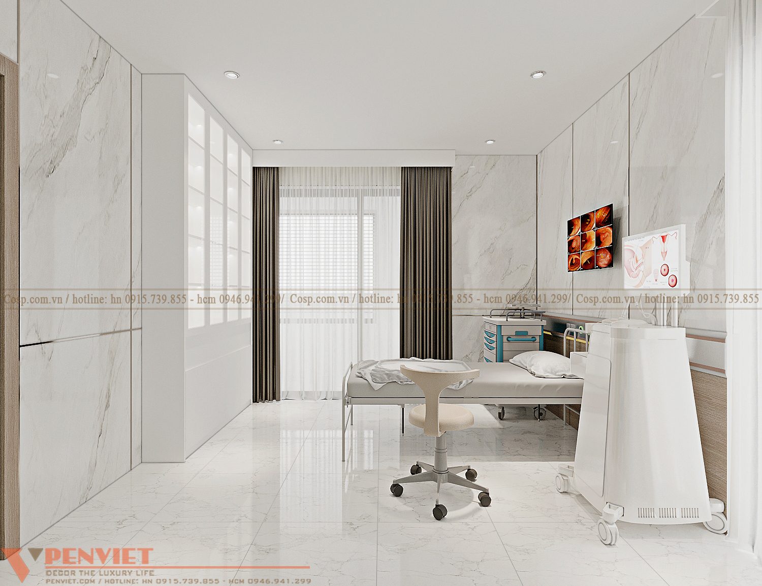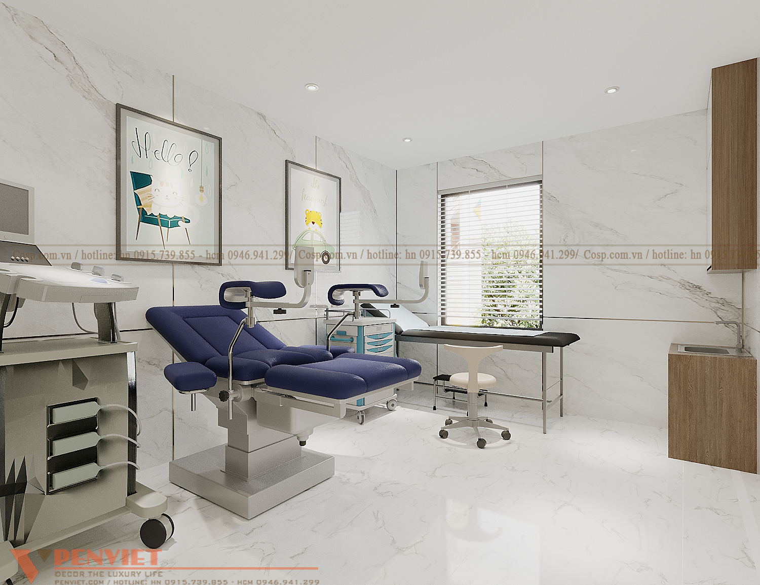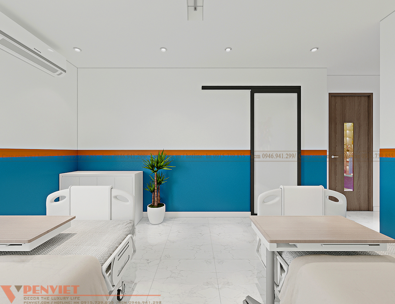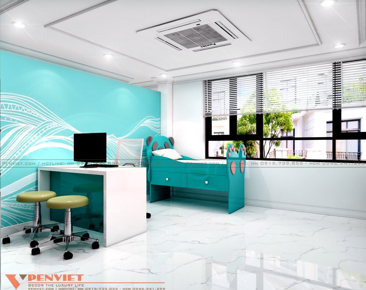 Đây là nơi thăm khám tổng quát cho bệnh nhân nhí, vì thế, đồ nội thất và trang thiết bị đặc trưng được bố trí đầy đủ, đáp ứng được mọi nhu cầu trong không gian khép kín. Bệnh nhân nhí đến khám chữa bệnh thường mang tâm lý lo sợ, e ngại. Do vậy Penviet đã lựa chọn tông màu trắng chủ đạo để không gian thông thoáng và dễ chịu, kết hợp màu sắc sinh động trang trí sẽ khơi dậy sự thích thú ở trẻ em.