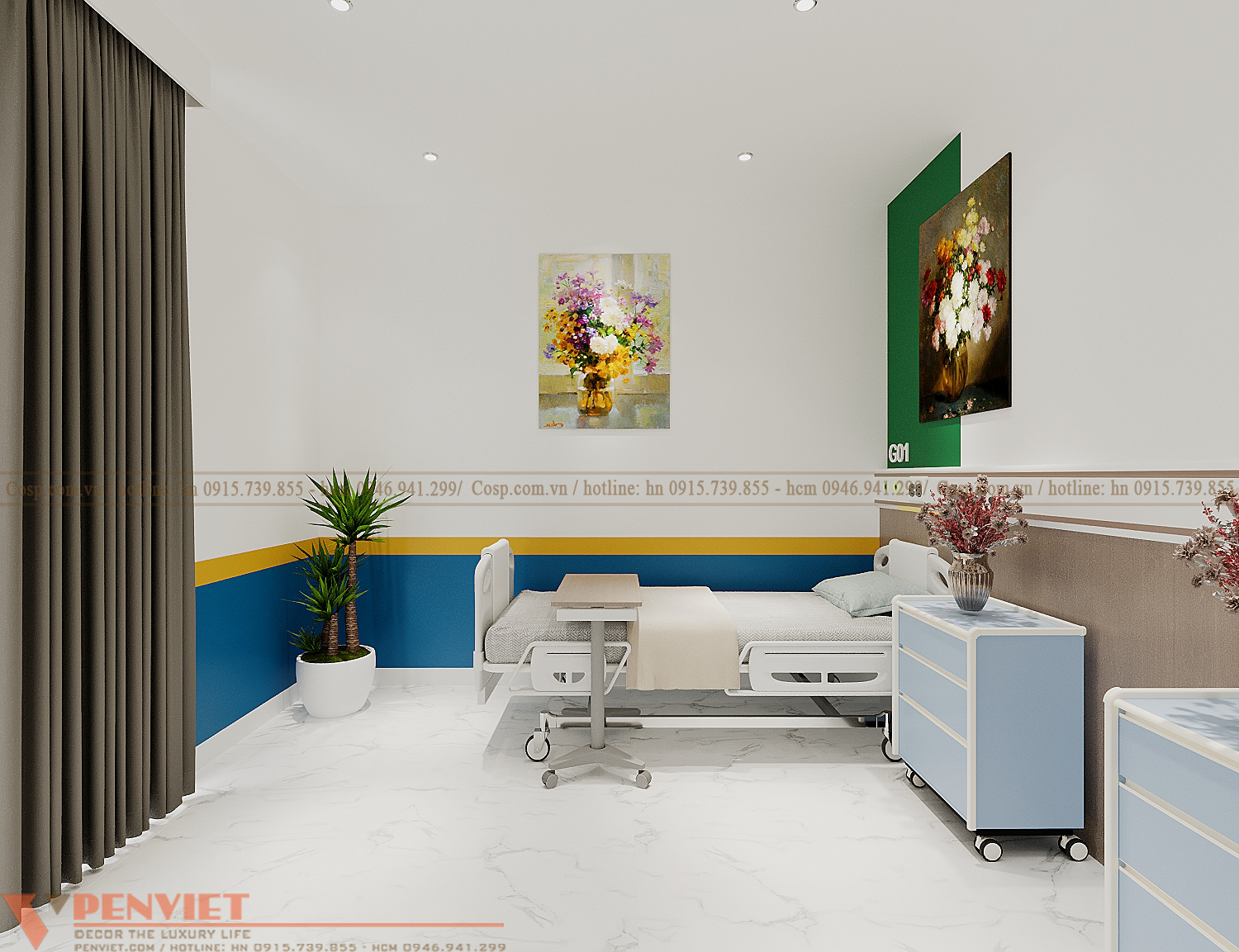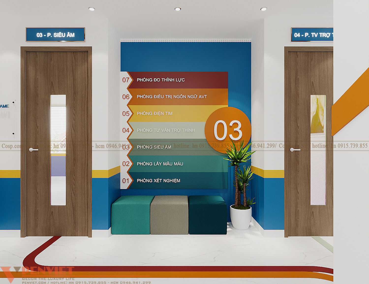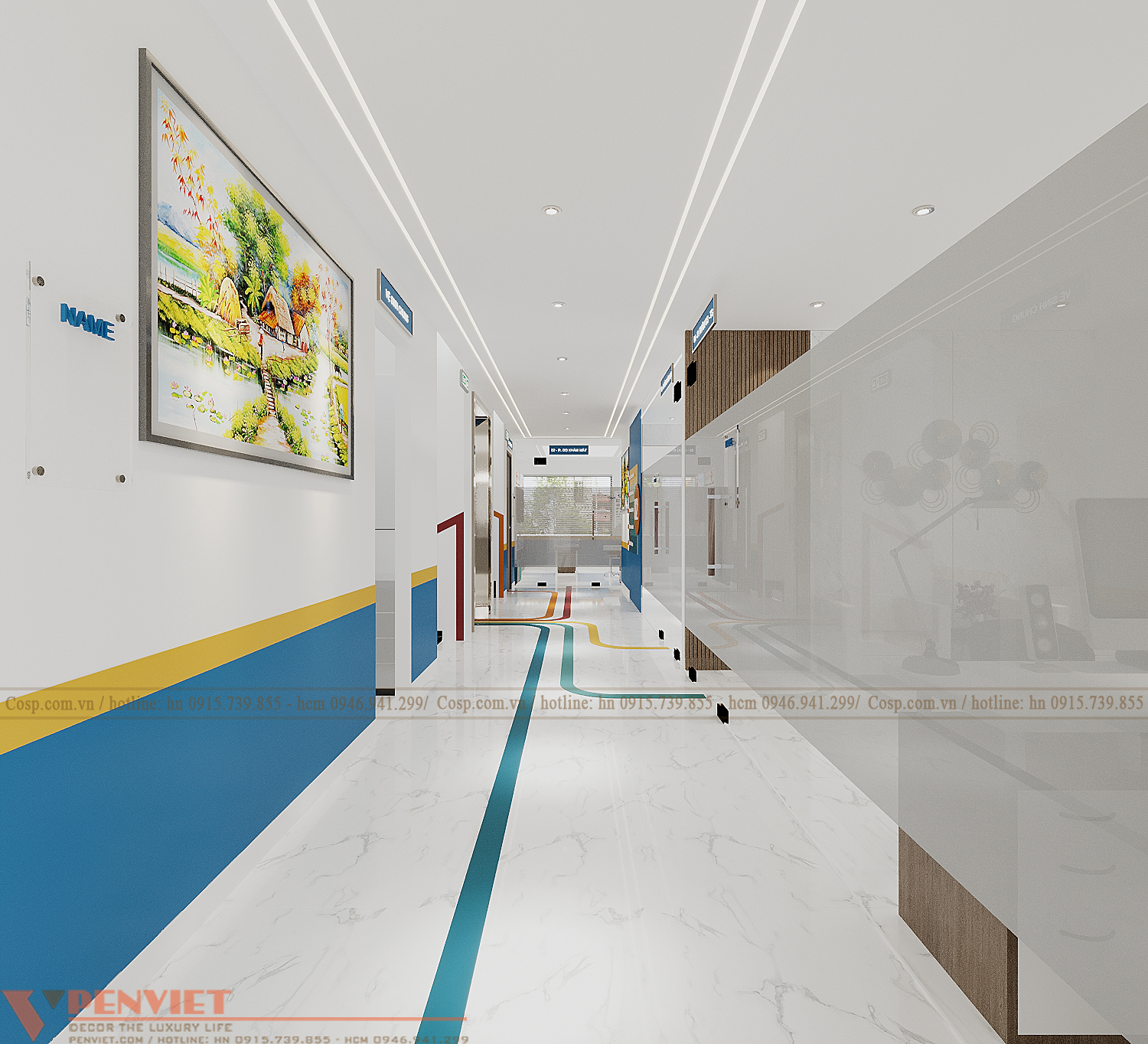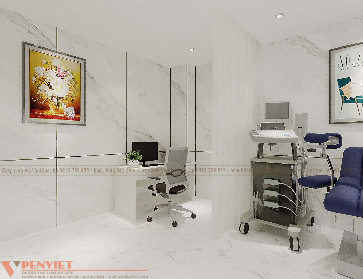 Đây là nơi thăm khám tổng quát cho bệnh nhân nhí, vì thế, đồ nội thất và trang thiết bị đặc trưng được bố trí đầy đủ, đáp ứng được mọi nhu cầu trong không gian khép kín. Bệnh nhân nhí đến khám chữa bệnh thường mang tâm lý lo sợ, e ngại. Do vậy Penviet đã lựa chọn tông màu trắng chủ đạo để không gian thông thoáng và dễ chịu, kết hợp màu sắc sinh động trang trí sẽ khơi dậy sự thích thú ở trẻ em.