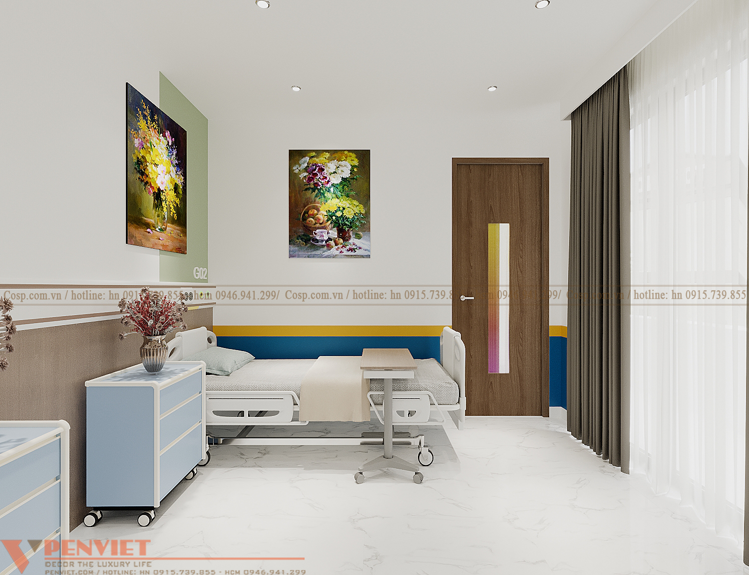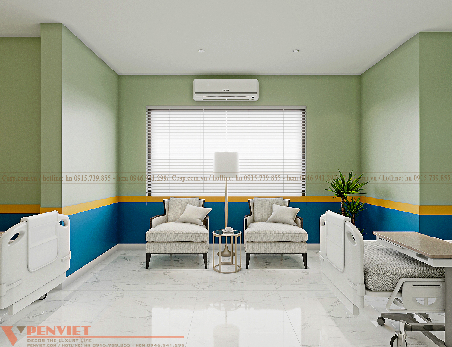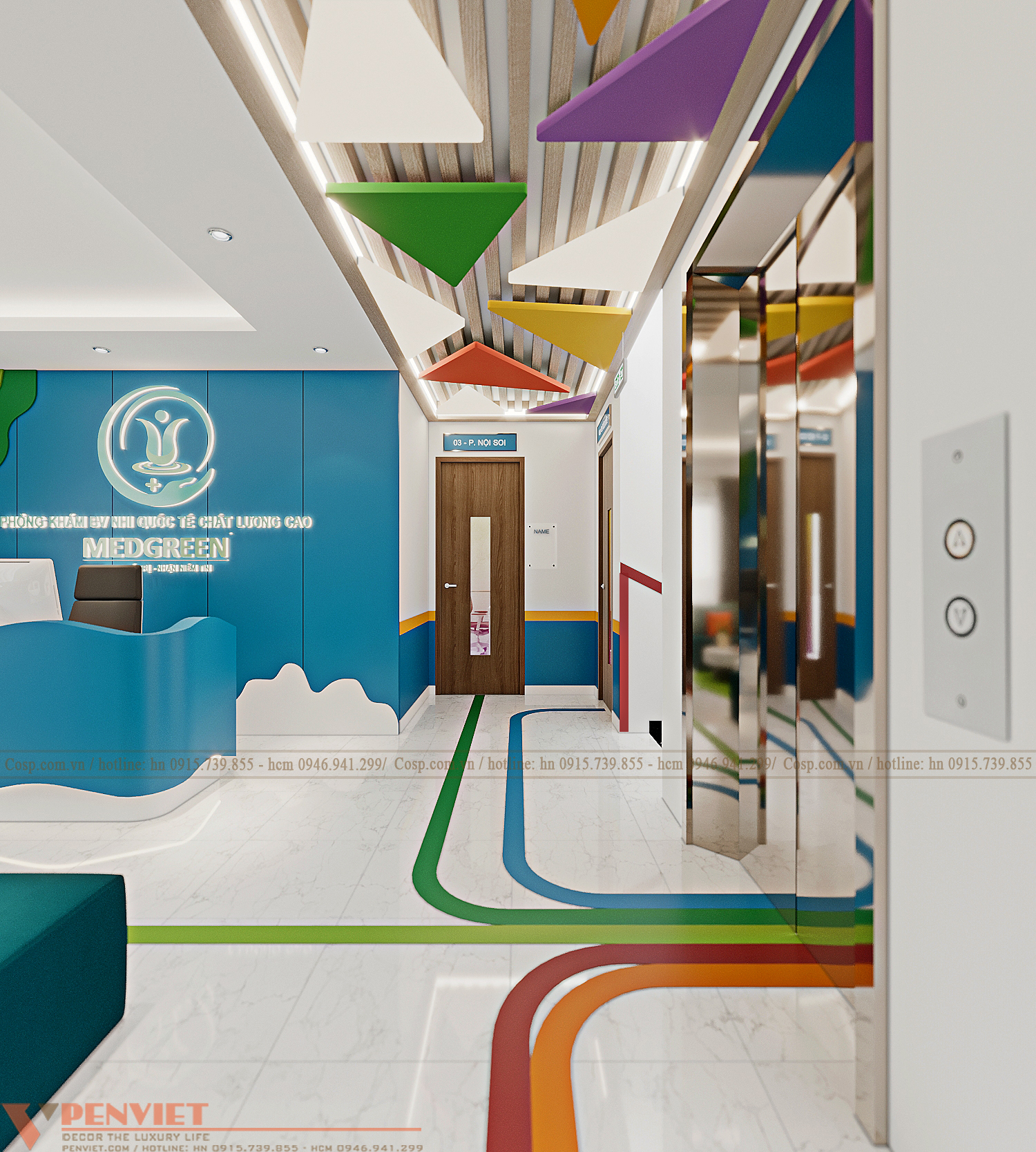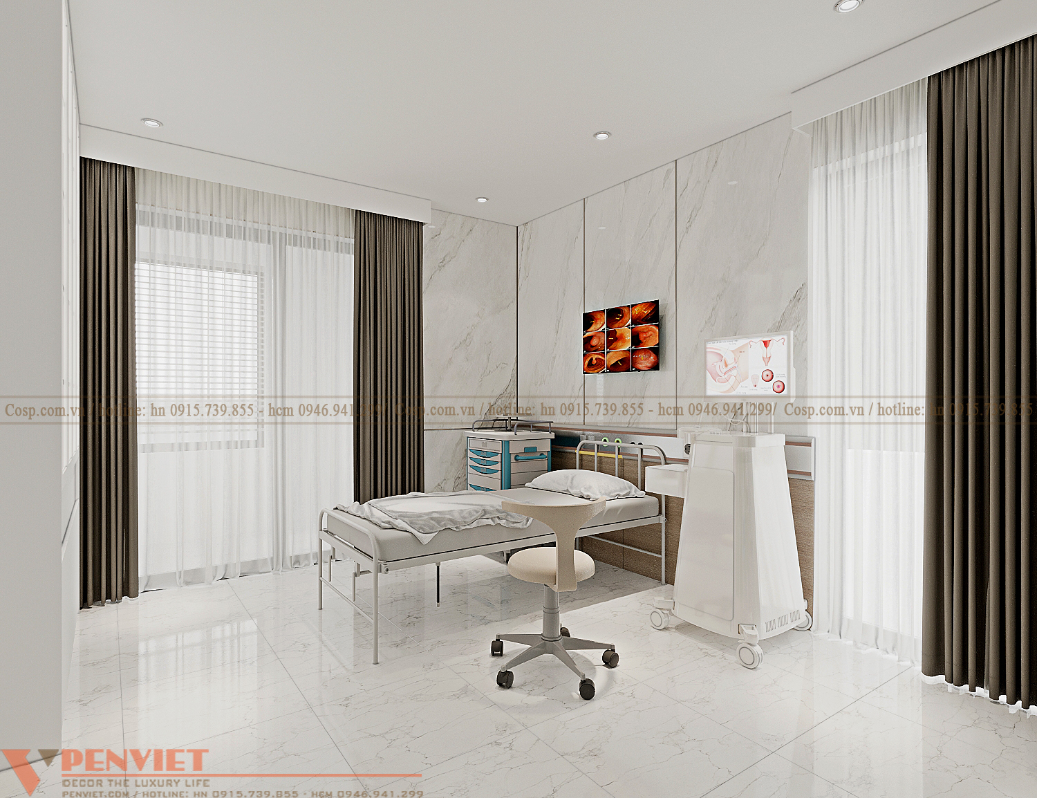 Đây là nơi thăm khám tổng quát cho bệnh nhân nhí, vì thế, đồ nội thất và trang thiết bị đặc trưng được bố trí đầy đủ, đáp ứng được mọi nhu cầu trong không gian khép kín. Bệnh nhân nhí đến khám chữa bệnh thường mang tâm lý lo sợ, e ngại. Do vậy Penviet đã lựa chọn tông màu trắng chủ đạo để không gian thông thoáng và dễ chịu, kết hợp màu sắc sinh động trang trí sẽ khơi dậy sự thích thú ở trẻ em.
