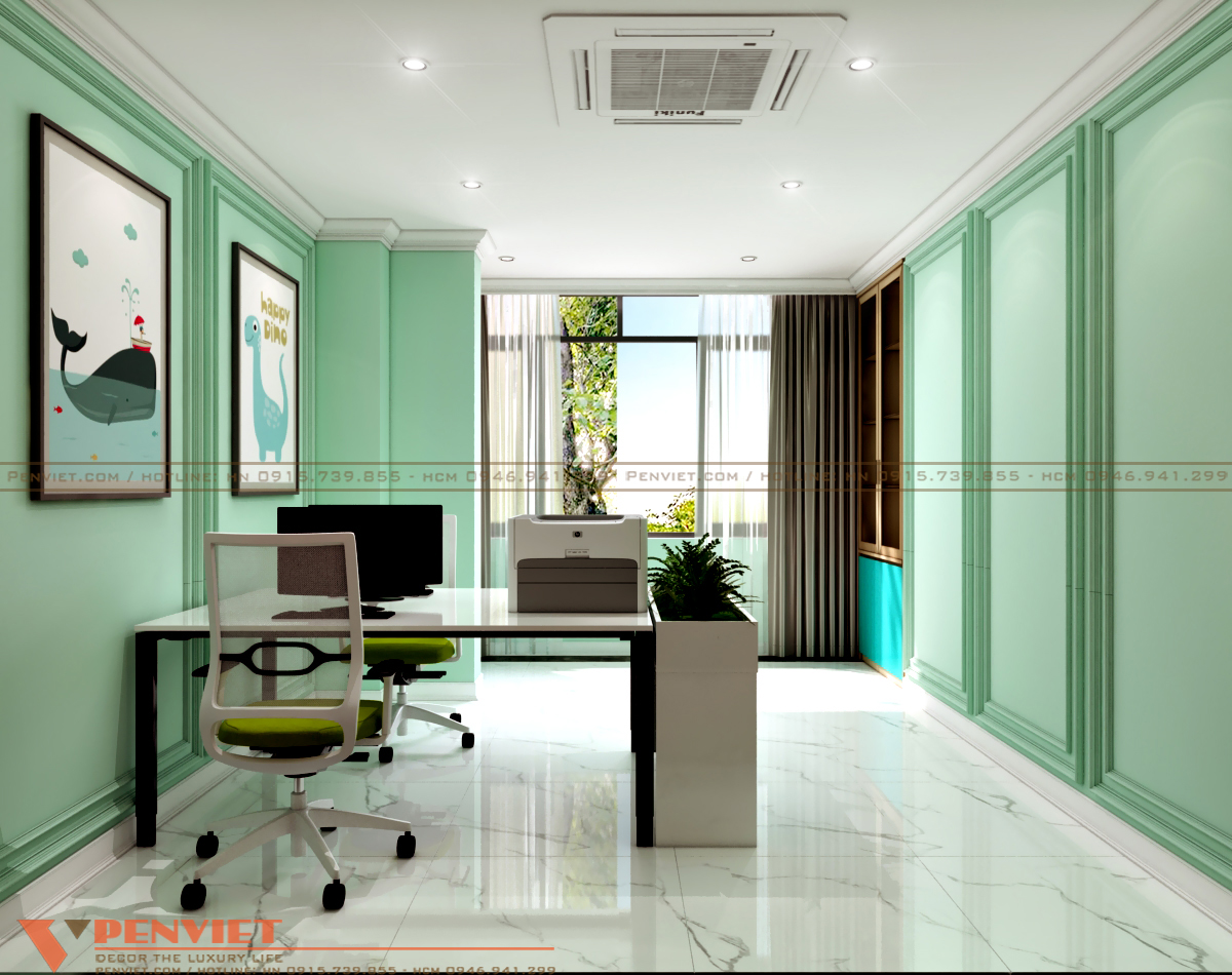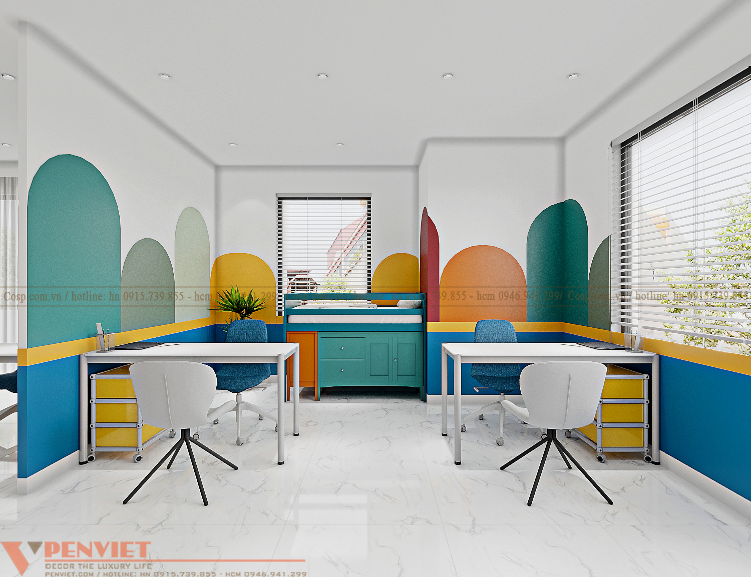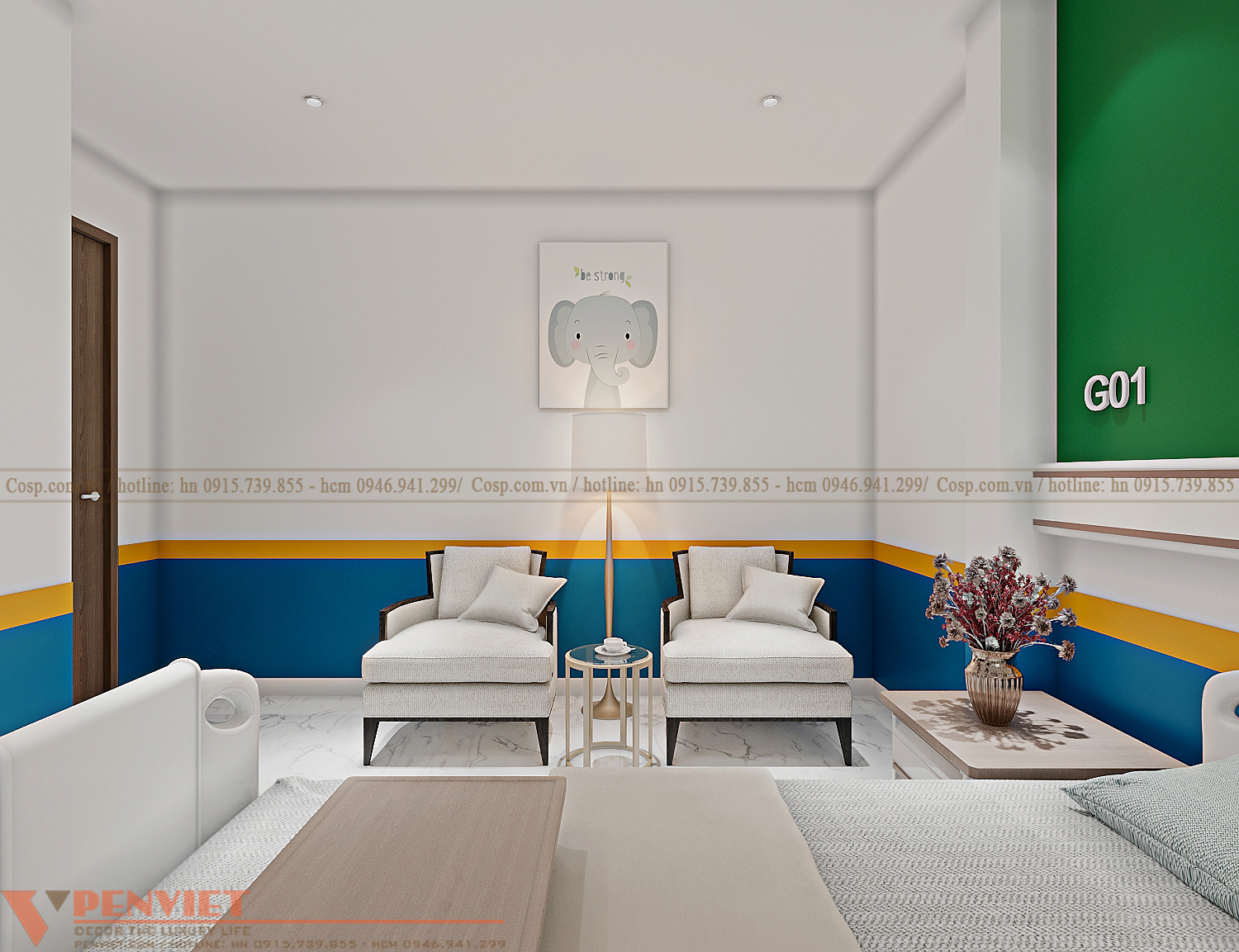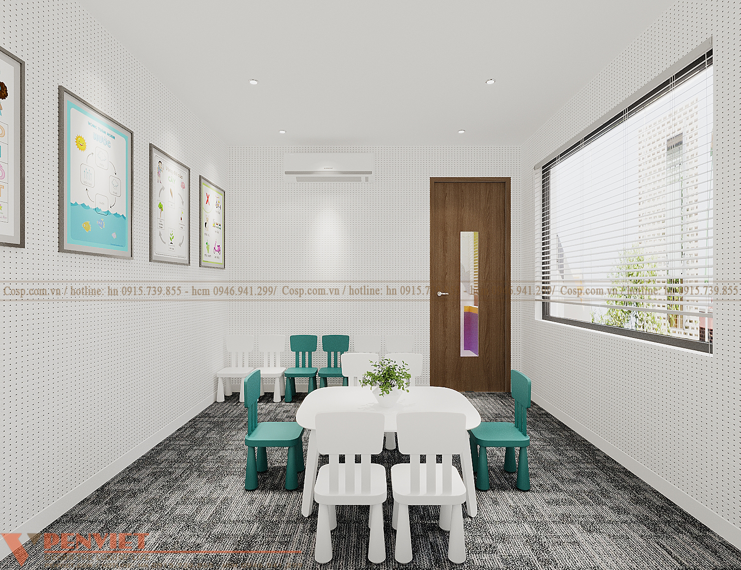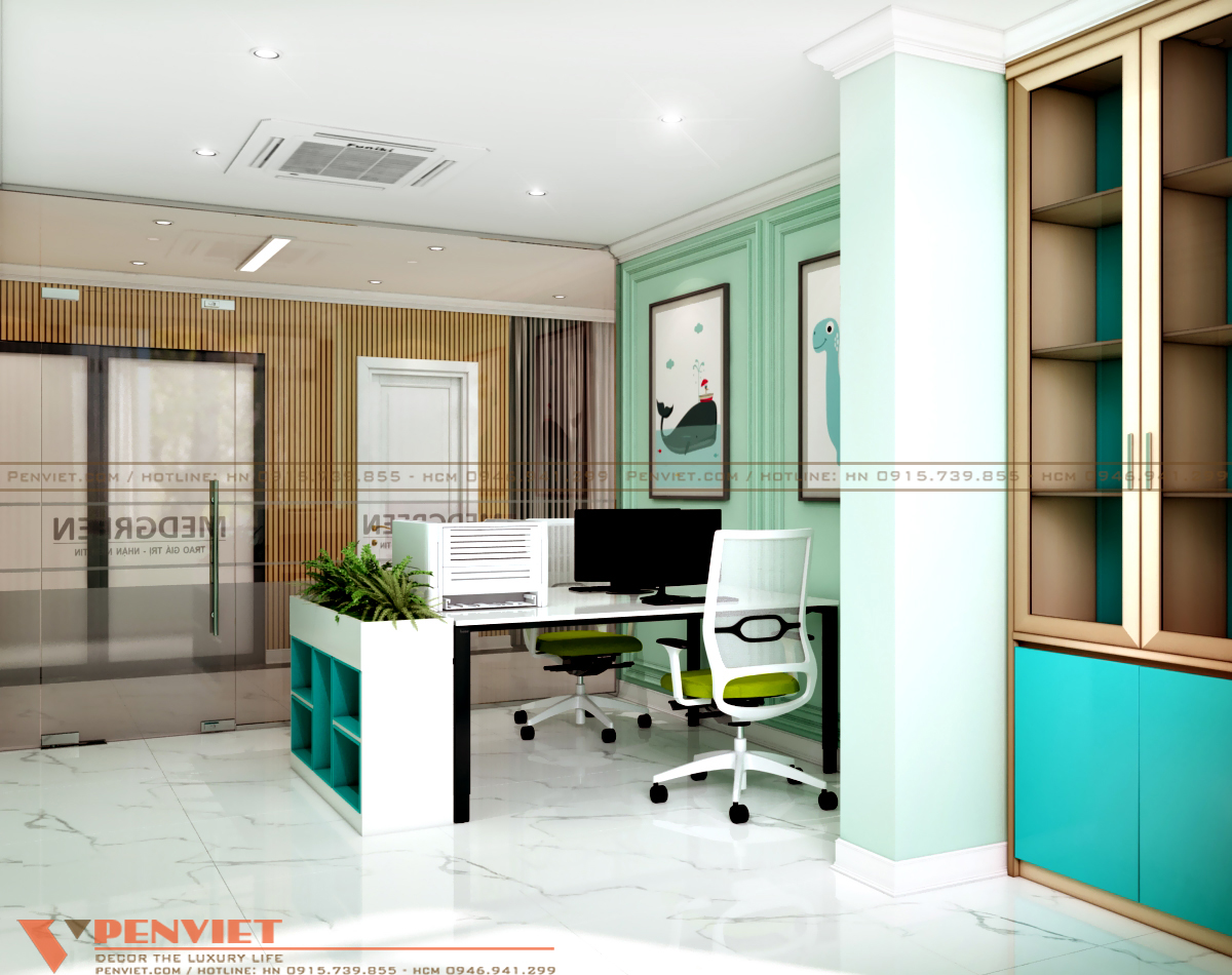 Đây là nơi thăm khám tổng quát cho bệnh nhân nhí, vì thế, đồ nội thất và trang thiết bị đặc trưng được bố trí đầy đủ, đáp ứng được mọi nhu cầu trong không gian khép kín. Bệnh nhân nhí đến khám chữa bệnh thường mang tâm lý lo sợ, e ngại. Do vậy Penviet đã lựa chọn tông màu trắng chủ đạo để không gian thông thoáng và dễ chịu, kết hợp màu sắc sinh động trang trí sẽ khơi dậy sự thích thú ở trẻ em.