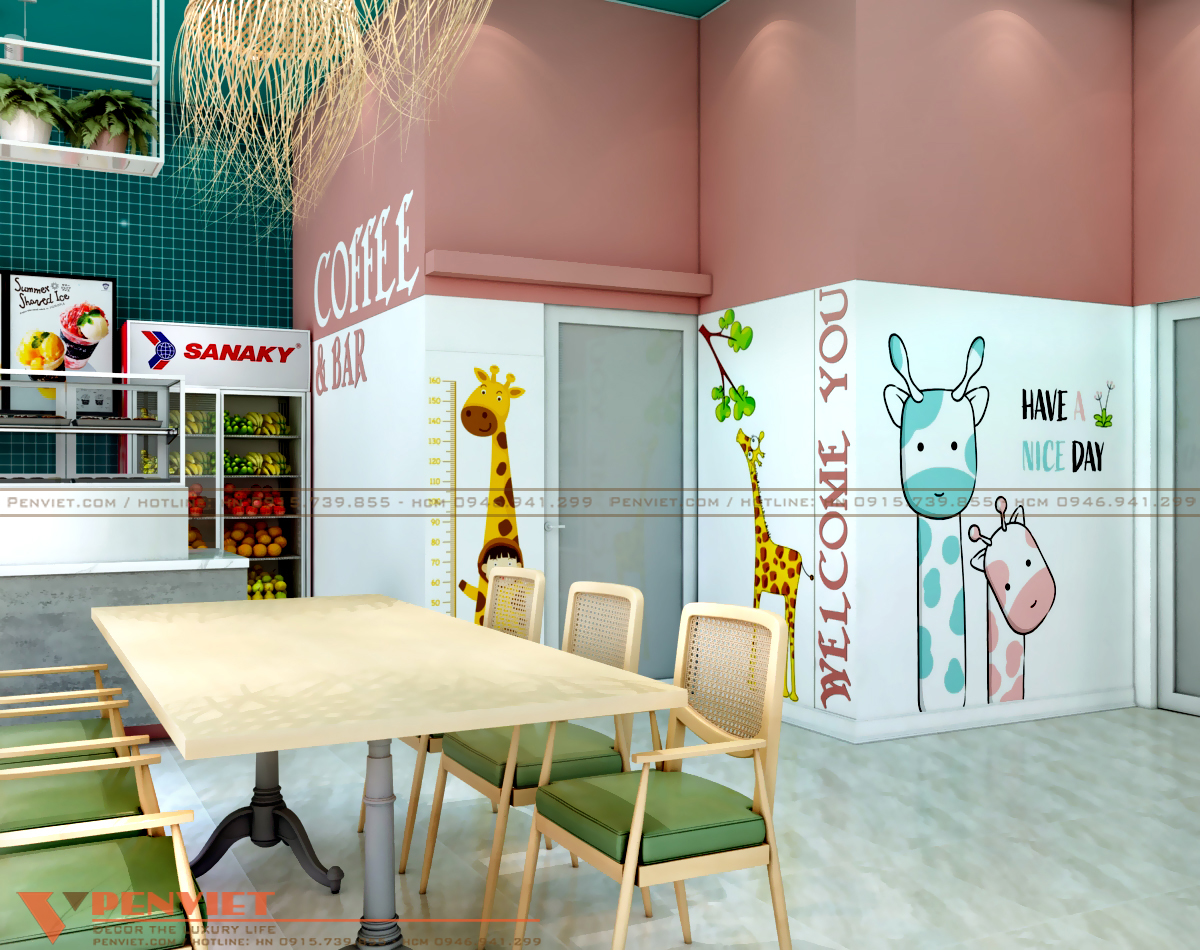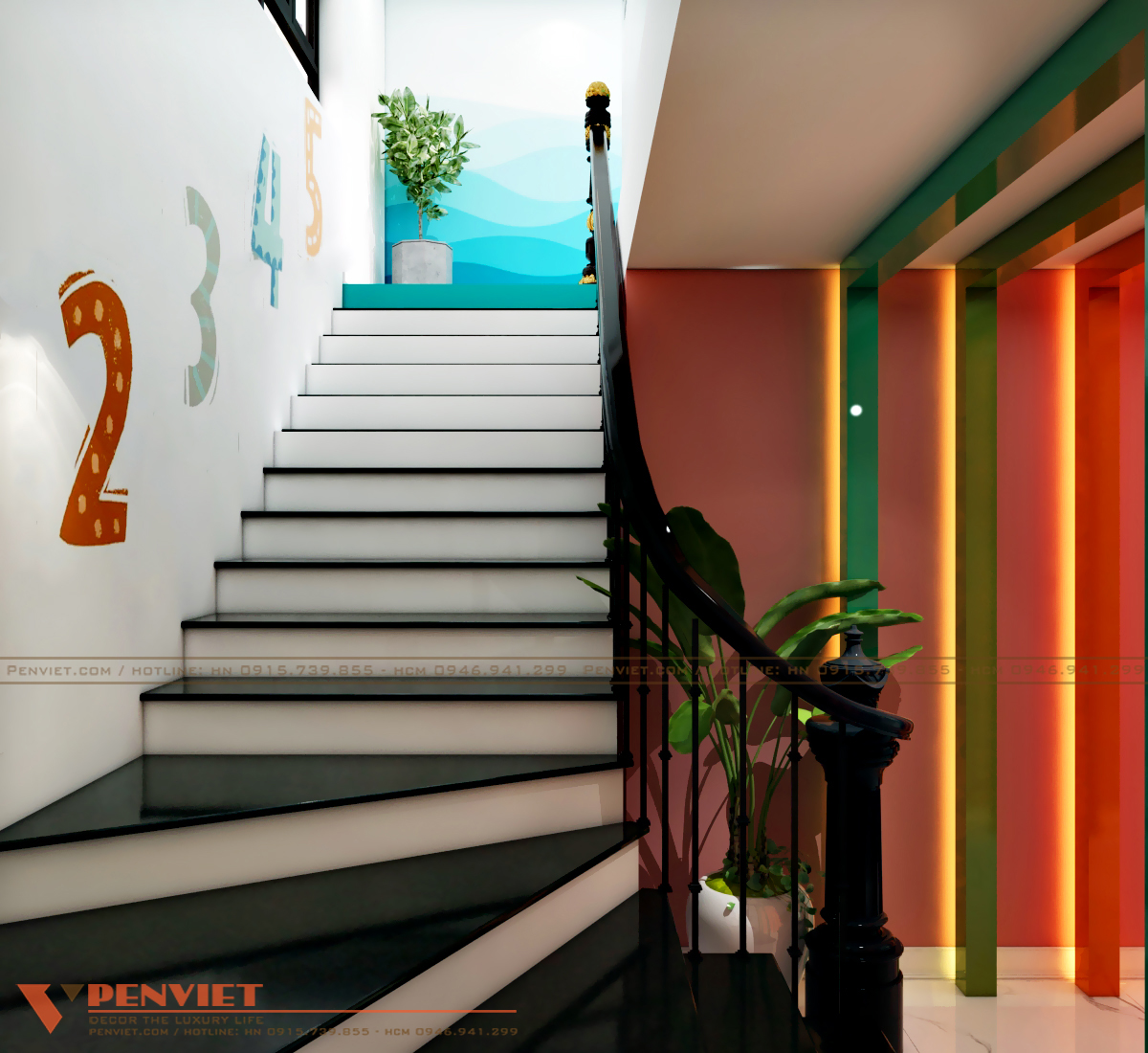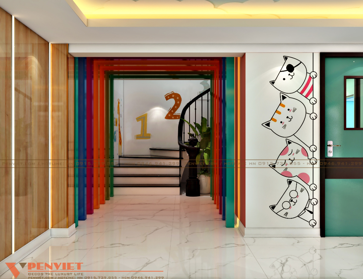 Với đối tượng trẻ nhỏ là chủ yếu, nên kiến trúc sư đã tinh tế biến hóa trần nhà và tường nhà trở nên sinh động hơn bằng việc vẽ tranh với chủ đề gần gũi với trẻ.