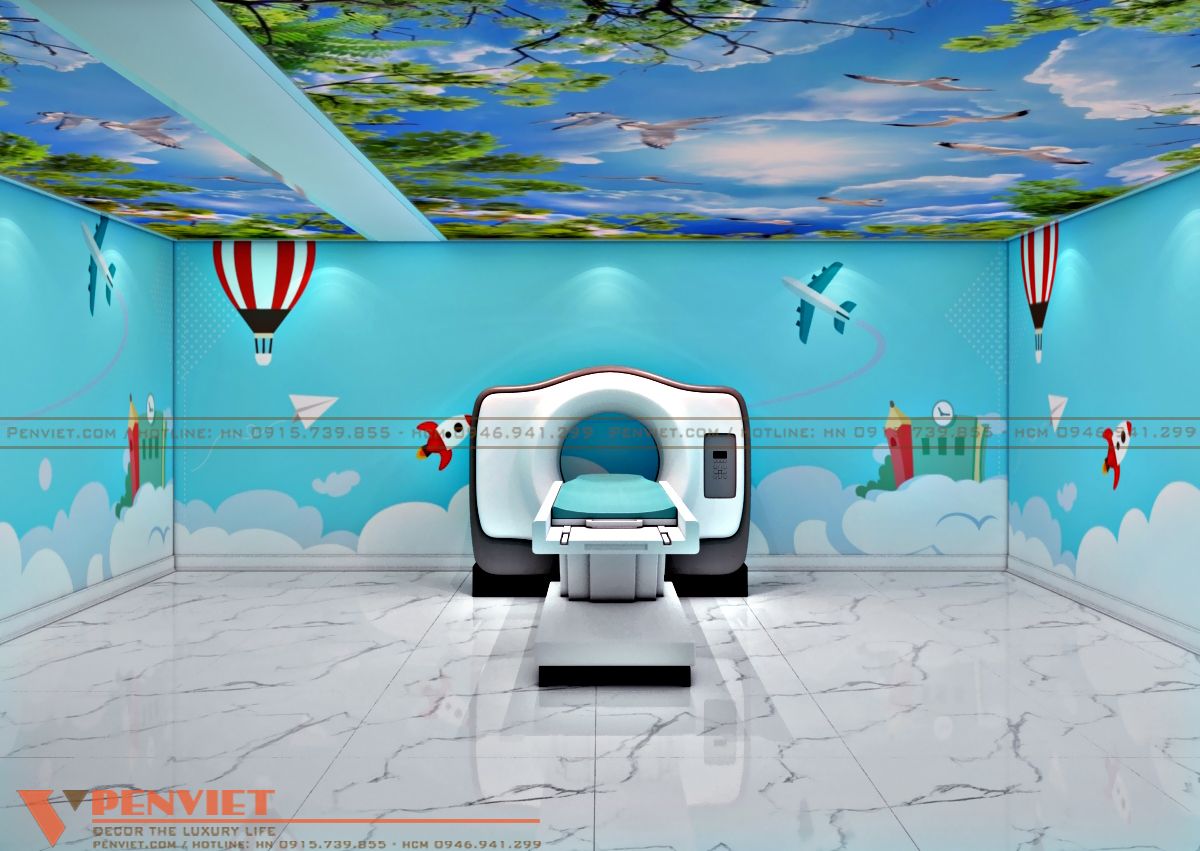 Thiết kế phòng siêu âm vẫn tạo được không gian nhiều màu sắc và thu hút trẻ. Ví dụ như: Sơn tường nhiều màu sắc và hình dáng dễ thương, tranh in UV trên nền gỗ màu sắc sinh động.