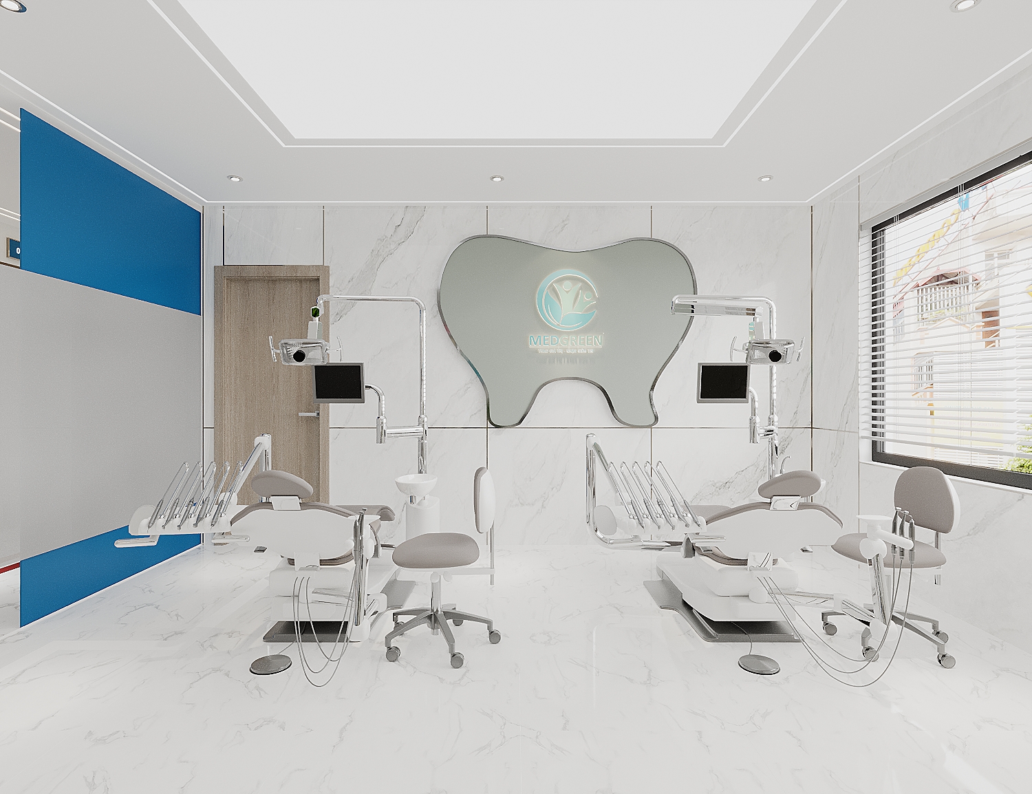 Thiết kế bệnh viên nhi đảm bảo mọi phòng chức năng đều đạt tiêu chuẩn. Và thiết kế phòng khám răng hàm mặt là một ví dụ điển hình nhất. Phòng khám răng hàm mặt 2 ghế với tổng diện tích hơn 10m2. Các ghế chỉnh nha được đặt song song và giữ khoảng cách lớn hơn 5m2 tạo lối đi thuận lợi và đảm bảo vệ sinh.