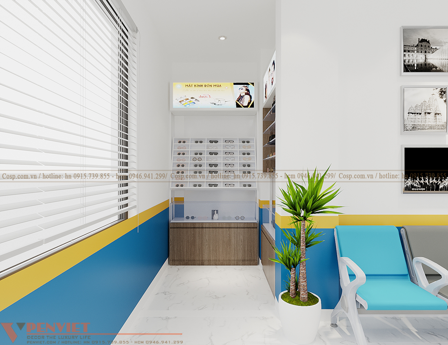 Thiết kế phòng khám mắt và đo mắt lựa chọn màu sắc sinh động phù hợp với tổng thể thiết kế bệnh viện nhi. Chất liệu gỗ MDF cốt xanh chống ẩm phủ melamin được thiết kế linh hoạt vừa có tuổi thọ lâu dài vừa mang đến vẻ đẹp hiện đại cho không gian.