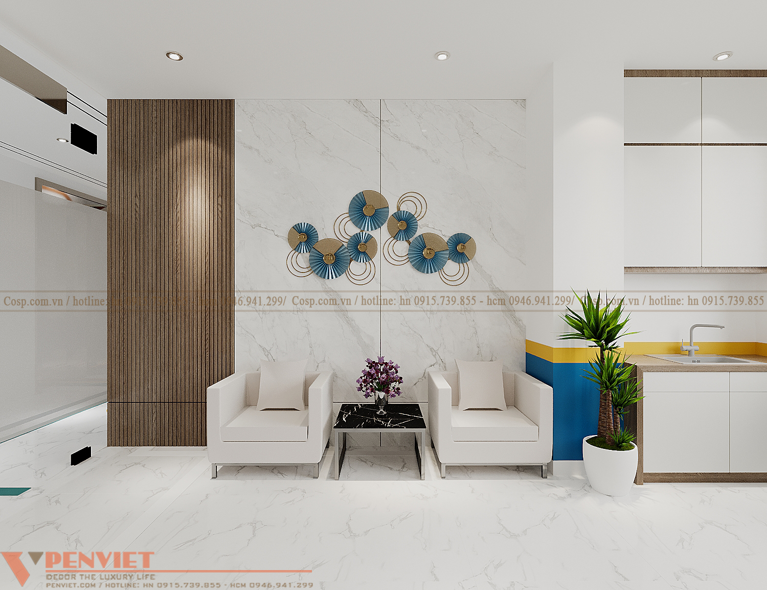 Nhằm mang lại tính thẩm mỹ cho khu vực tiếp đón, Penviet thi công ốp tường Tấm ốp PVC vân đá kết hợp gỗ MDF cốt xanh Thái Lan chống ẩm. Để tạo sự nổi bật cho không gian, chúng tôi sử dụng nẹp inox vàng sáng, thêm hệ thống đèn led thanh màu sắc nhẹ nhàng mang đến cảm giác thoải mái, dễ chịu.