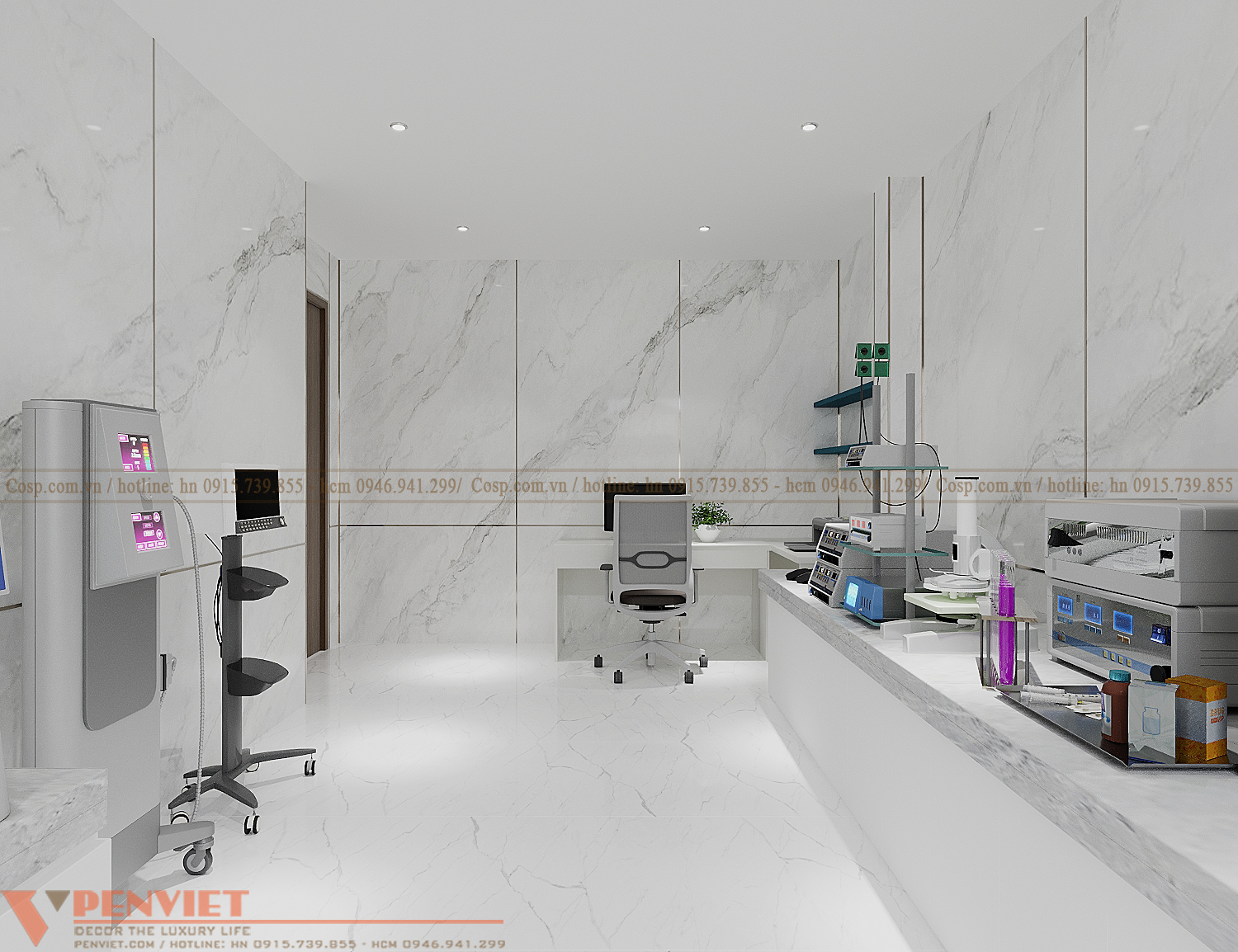 Phòng thủ thuật là nơi thực hiện nhiều hoạt động can thiệp, thăm khám. Do đó yếu tố vệ sinh cần được đảm bảo tuyệt đối để tránh lây nhiễm chéo và gây nhiễm trùng cho bệnh nhân. Hiểu được điều này, chúng tôi tư vấn cho khách hàng cải tạo tường phòng khám bằng việc ốp PVC vân đá nẹp inox. Điều này không chỉ mang đến sự mới lạ cho không gian mà còn chất liệu này dễ dàng vệ sinh lau chùi giúp phòng khám luôn luôn vệ sinh.
