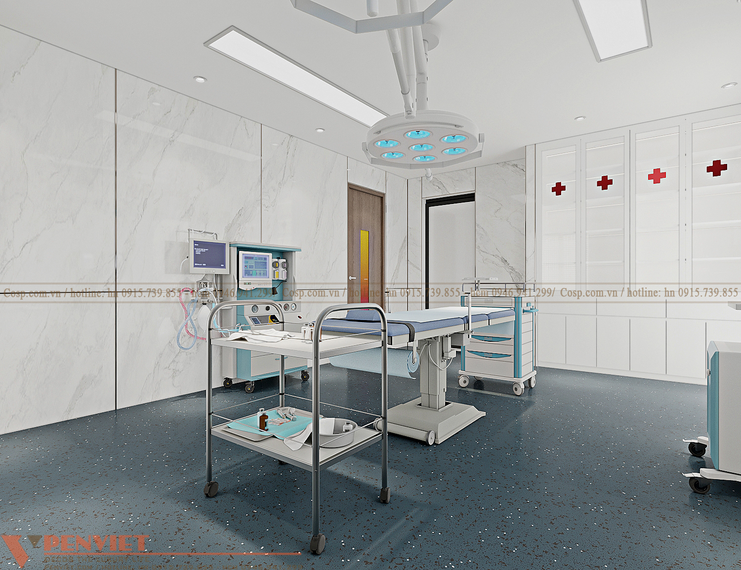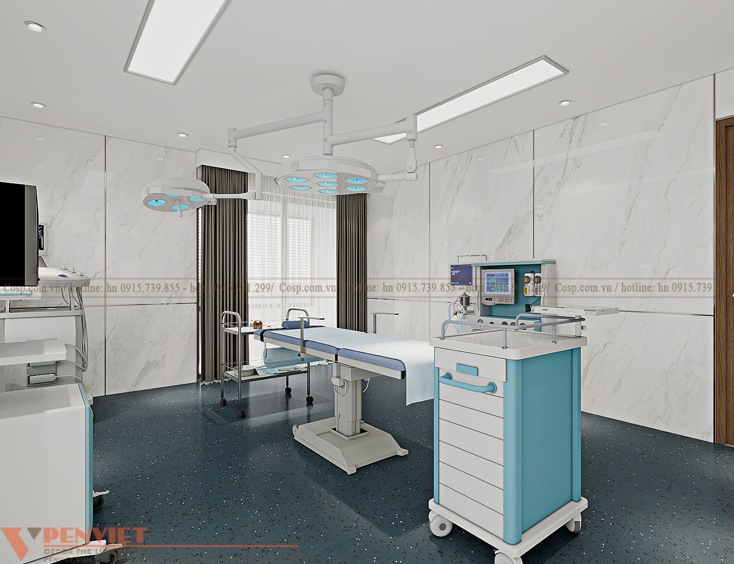 Trong tổng thế thiết kế bệnh viện nhi quốc tế Medgreen, đối với các phòng chức năng thực hiện những dịch vụ can thiệp vào cơ thể đều được thiết kế với những tiêu chuẩn khắt khe. Cụ thể ở phòng phẫu thuật này, chúng tôi vẫn tư vấn khách hàng cải tạo toàn bộ tường nhà bằng việc ốp toàn bộ tấm PVC vân đá. Chất liệu này không chỉ có giá trị thẩm mỹ mà còn đảm bảo yếu tố an toàn vệ sinh.