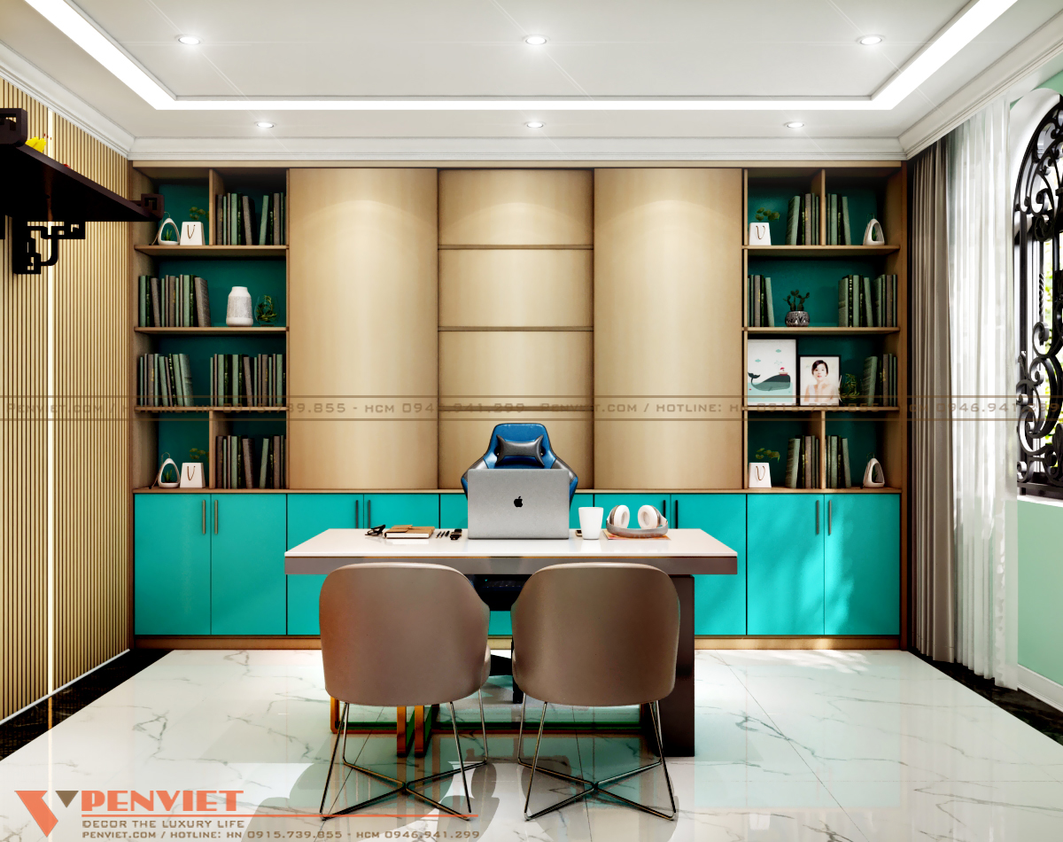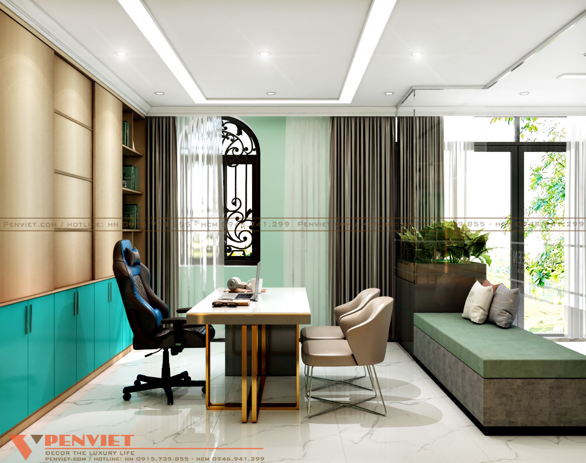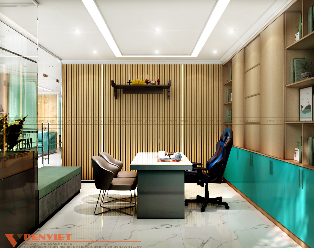 Phòng giám đốc mang đến diện mạo hiện đại, sang trọng và chuyên nghiệp. Điều này được thể hiện ở phong cách thiết kế hiện đại với đồ nội thất gỗ thiết kế kiểu dáng tuy đơn giản nhưng vẫn được làm nổi bật nhờ những chi tiết nhỏ.