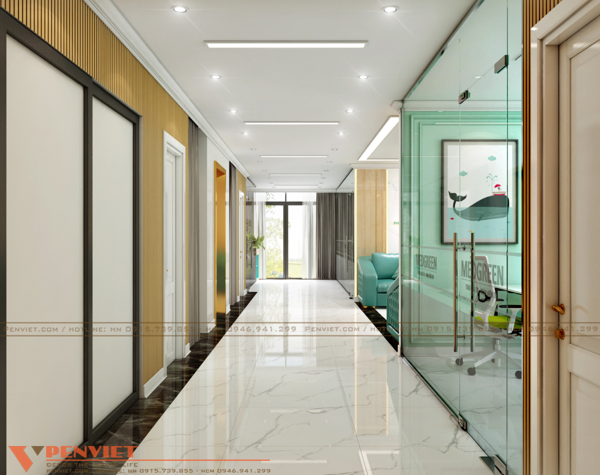 Tầng 6 của bệnh viện được setup thành khu văn phòng với các phòng giám đốc, hành chính, và kinh doanh. Thiết kế khu vực văn phòng chúng tôi đã thực hiện phân chia không gian với kính: Kính cường lực Hải Long 10mm. Lối thiết kế đơn giản tạo không gian làm việc riêng tư, thoải mái. Đặc biệt, điều này cũng mang đến tính thẩm mỹ, nhất quán với tinh thần thiết kế bệnh viện nhi.