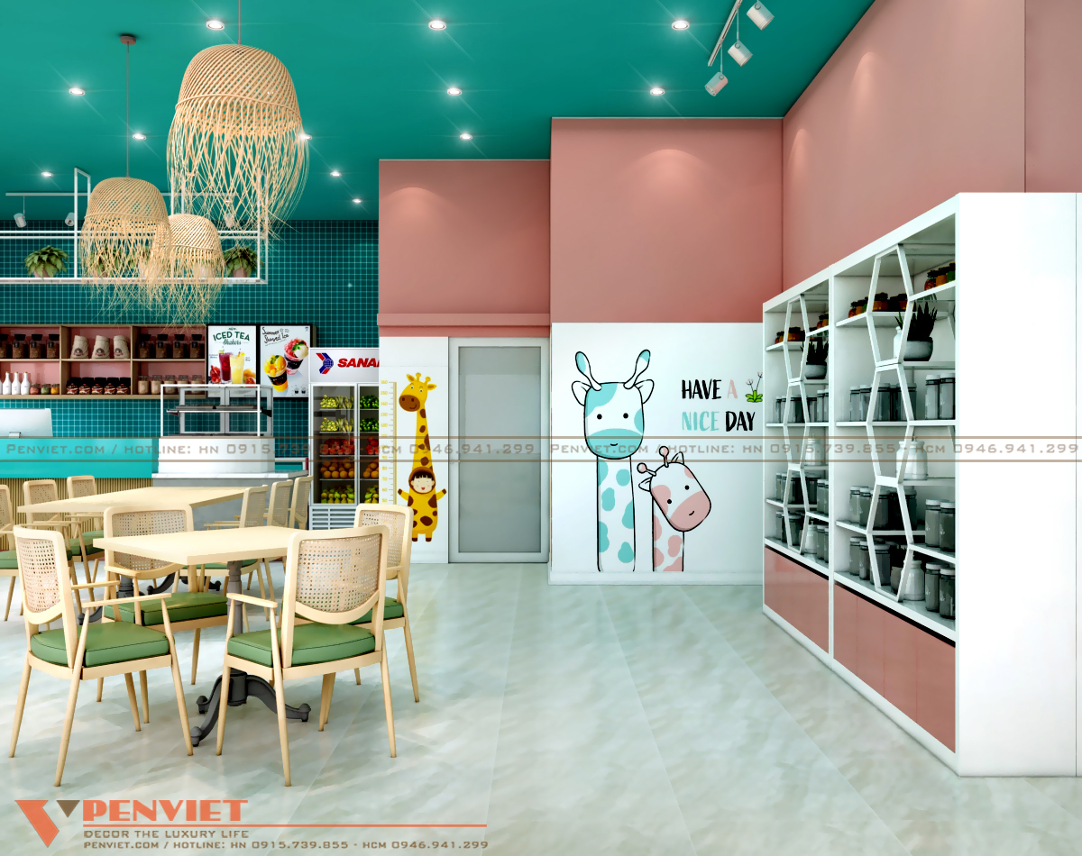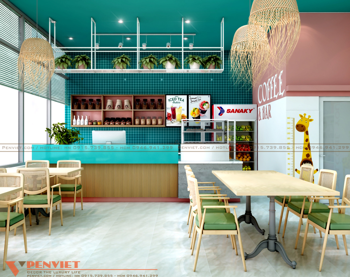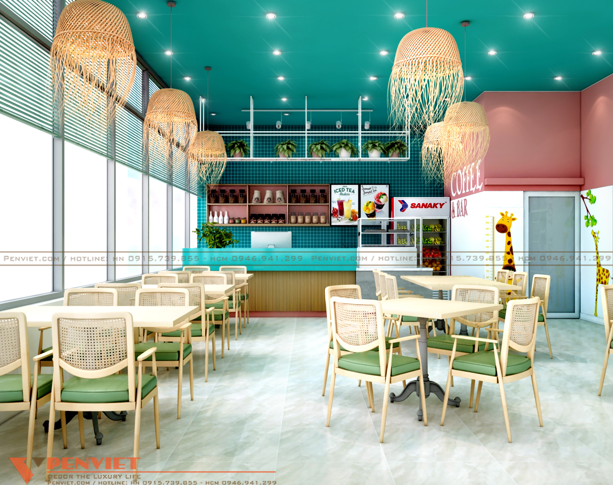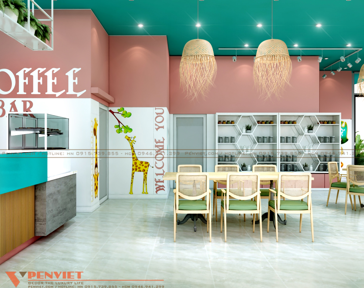 Vách tường sau quầy được làm mới bằng vách logo Gỗ MDF cốt xanh Thái Lan chống ẩm cắt CNC, nẹp nhôm đen. Logo và tên thương hiệu mica phát sáng màu trắng trên nền xanh sẽ tạo những ấn tượng sâu sắc với khách hàng.