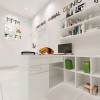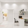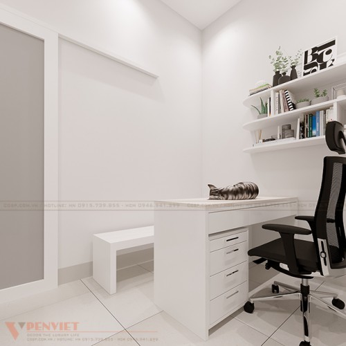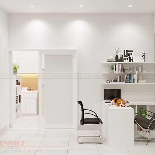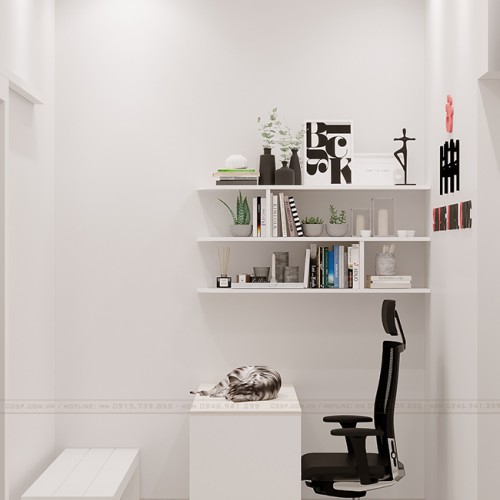 Phía trên bàn làm việc được chúng tôi bố trí các thanh đợt gỗ MDF chống ẩm phủ sơn 2K, giúp bác sĩ có thêm diện tích để sách, tài liệu hay đơn giản hơn là những món đồ decor đẹp mắt. Thiết kế vuông vắn và hạn chế các đồ nội thất tầm thấp giúp đảm bảo an toàn cho vật nuôi cũng như hạn chế rơi vỡ khi thú cưng chạy.