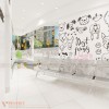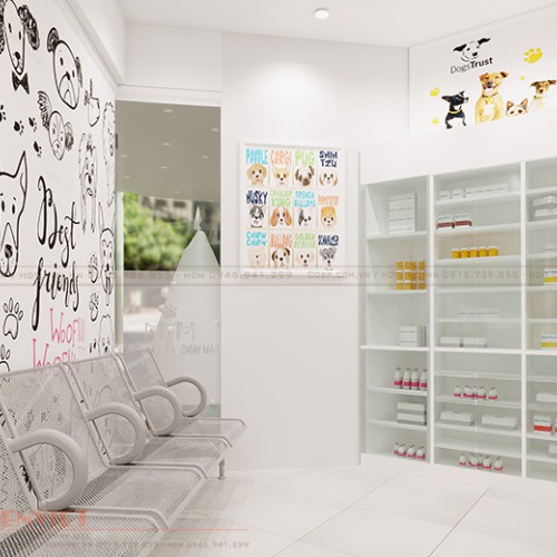 Tuy sử dụng gam màu trắng làm chủ đạo nhưng các kiến trúc sư đã khéo léo lồng ghép các chi tiết trang trí decor để tạo sự bắt mắt, gần gũi với khách hàng. Các họa tiết trang trí decor được lấy ý tưởng từ chủ đề vật nuôi giúp mang tới sự gần gũi và tạo nên không gian đẹp mắt. Sự kết hợp khéo léo giữa màu sắc và hệ thống ánh sáng giúp tạo không gian rộng mở, an tâm cho khách hàng.