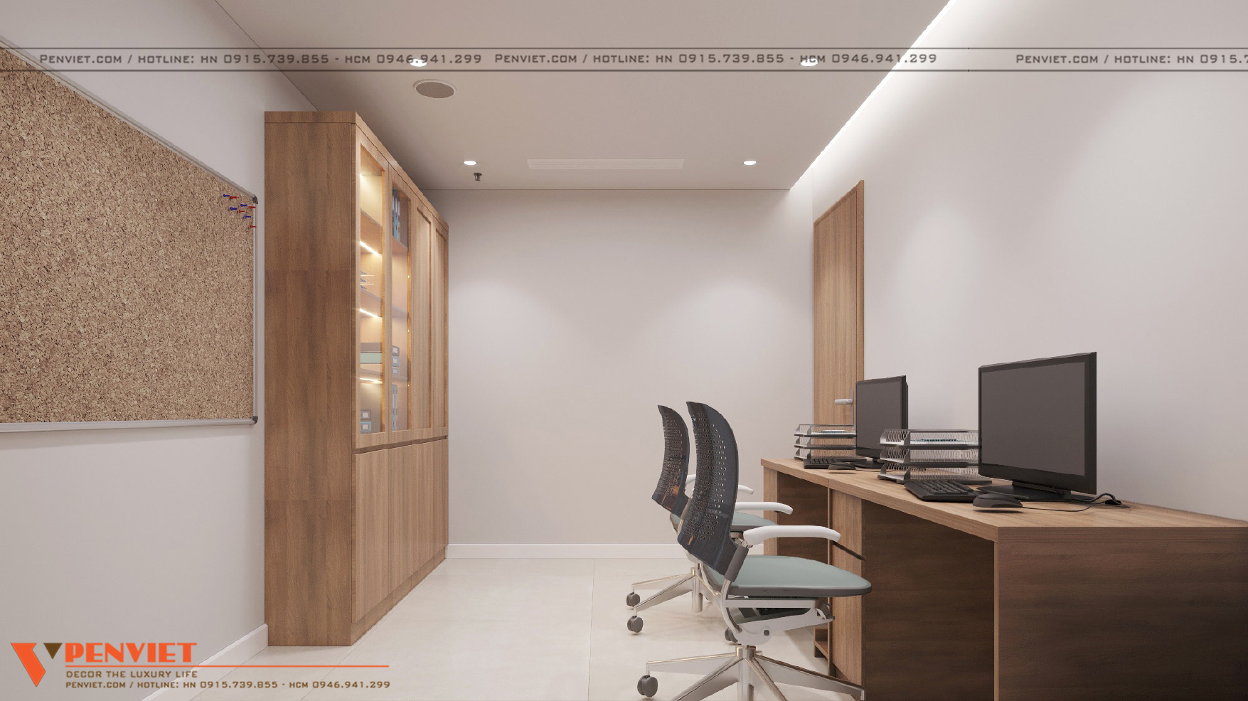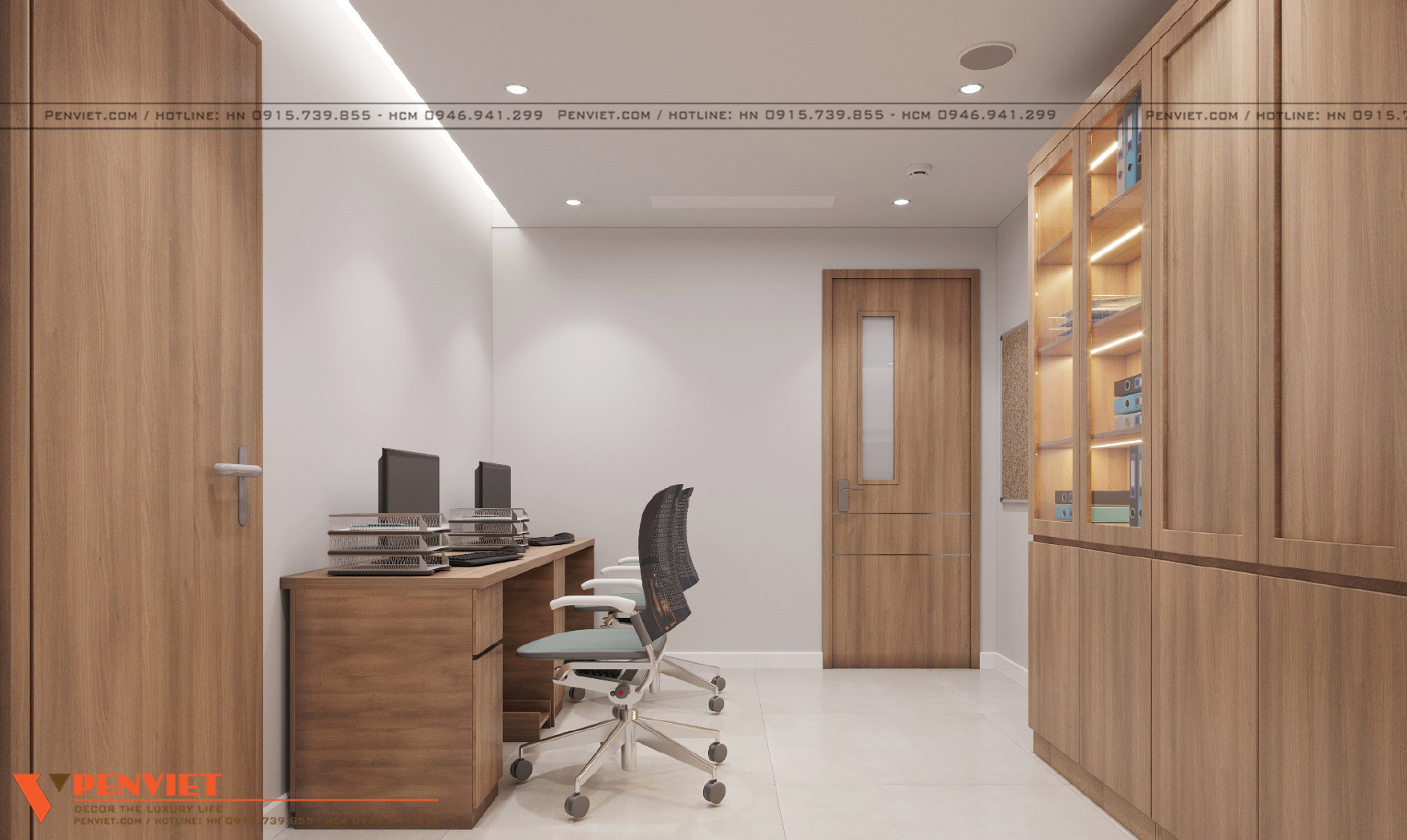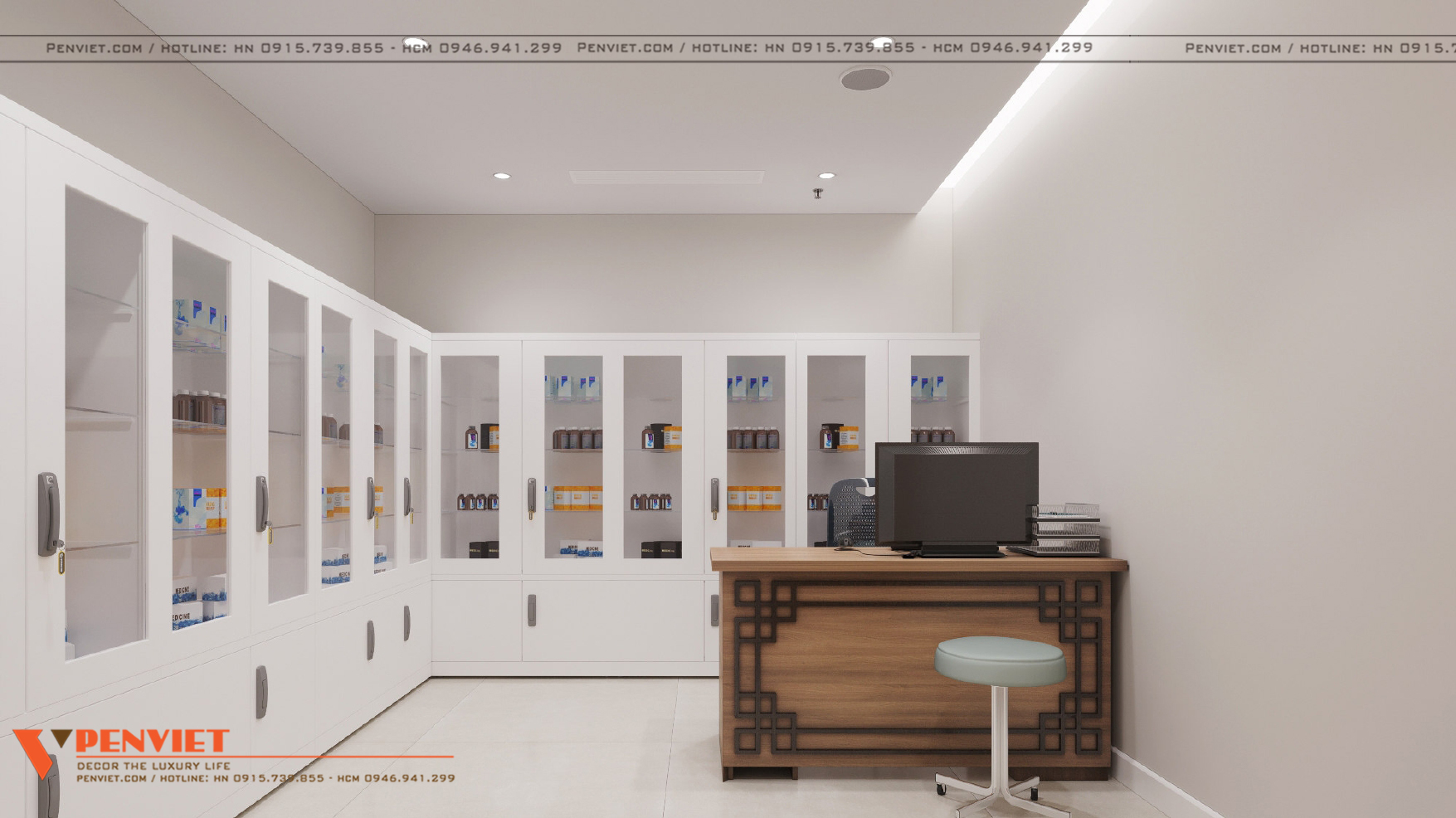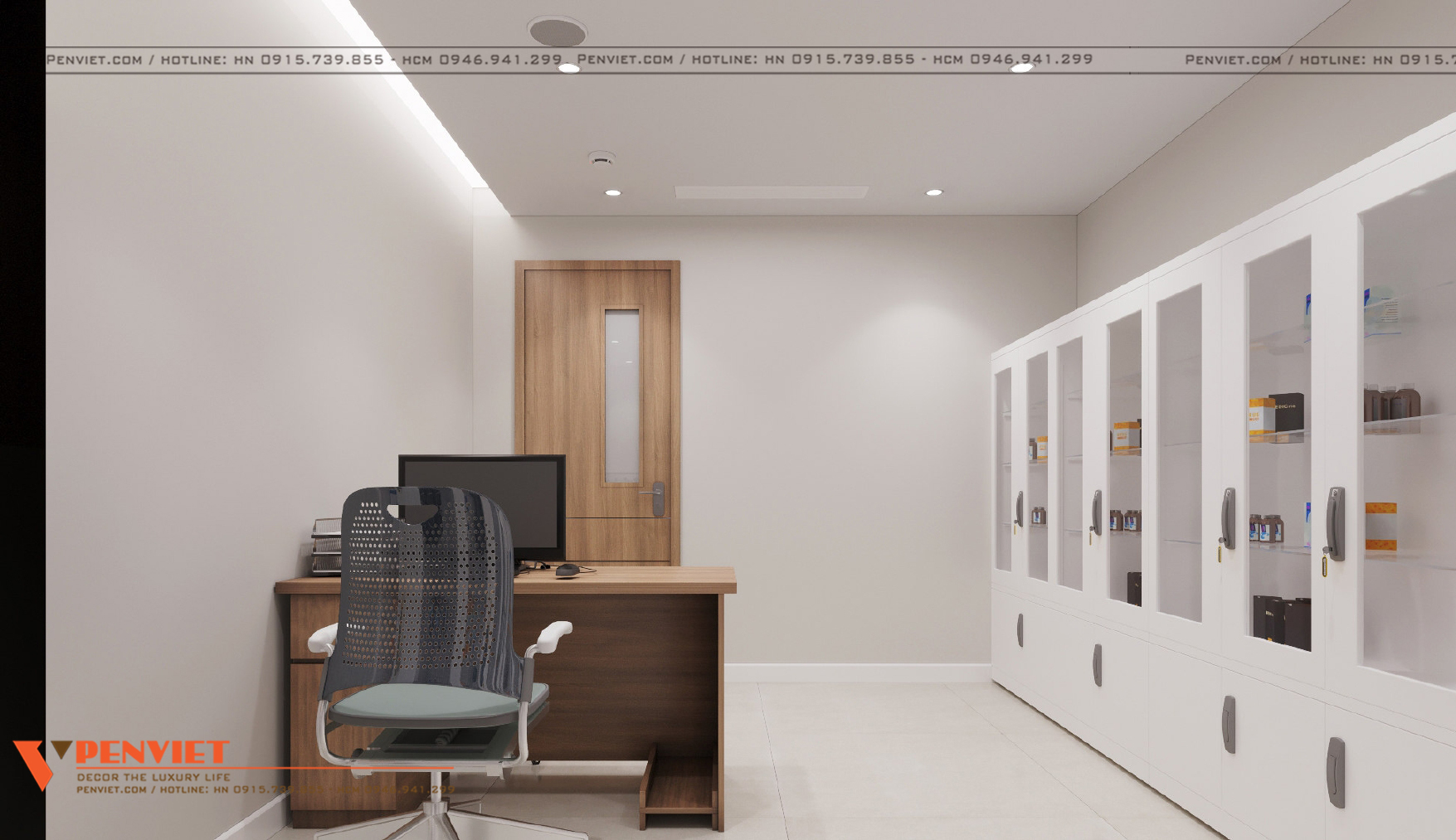 Do đó thiết kế phòng vật tư y tế, Penviet sử dụng hệ tủ lưu trữ chất liệu gỗ MDF phủ melamin nhiều ngăn nhỏ để dễ dàng sắp sếp phân loại vật tư y tế. Thêm vào đó, kết hợp cửa kính để nhân viên y tế dễ dàng tìm kiếm và quản lý.