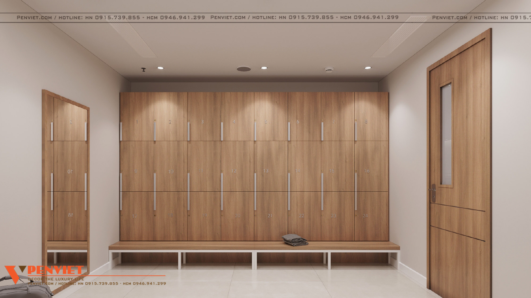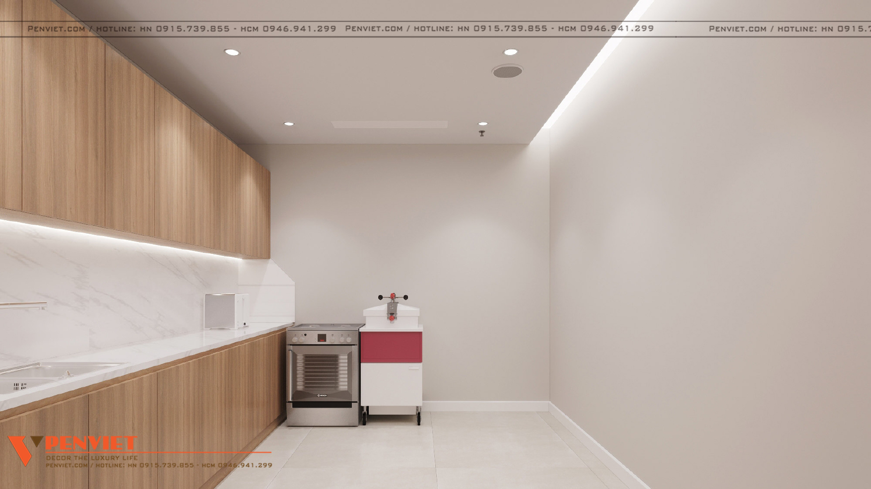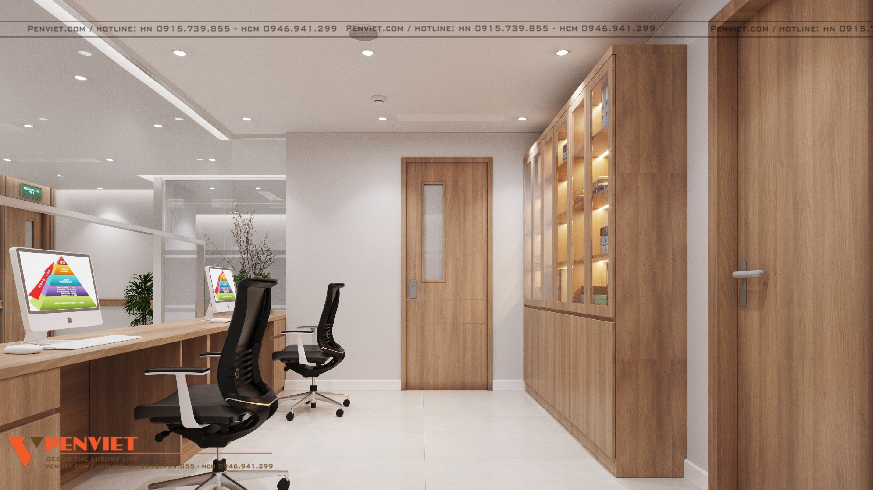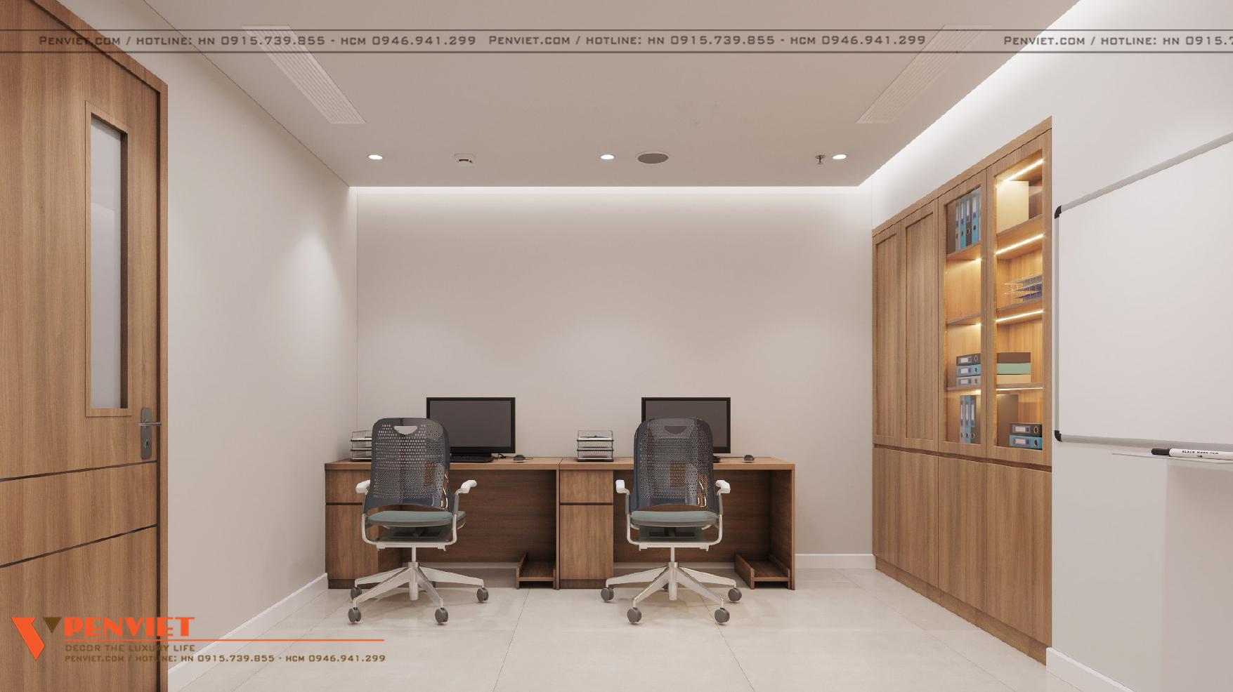 Do đó thiết kế phòng vật tư y tế, Penviet sử dụng hệ tủ lưu trữ chất liệu gỗ MDF phủ melamin nhiều ngăn nhỏ để dễ dàng sắp sếp phân loại vật tư y tế. Thêm vào đó, kết hợp cửa kính để nhân viên y tế dễ dàng tìm kiếm và quản lý.