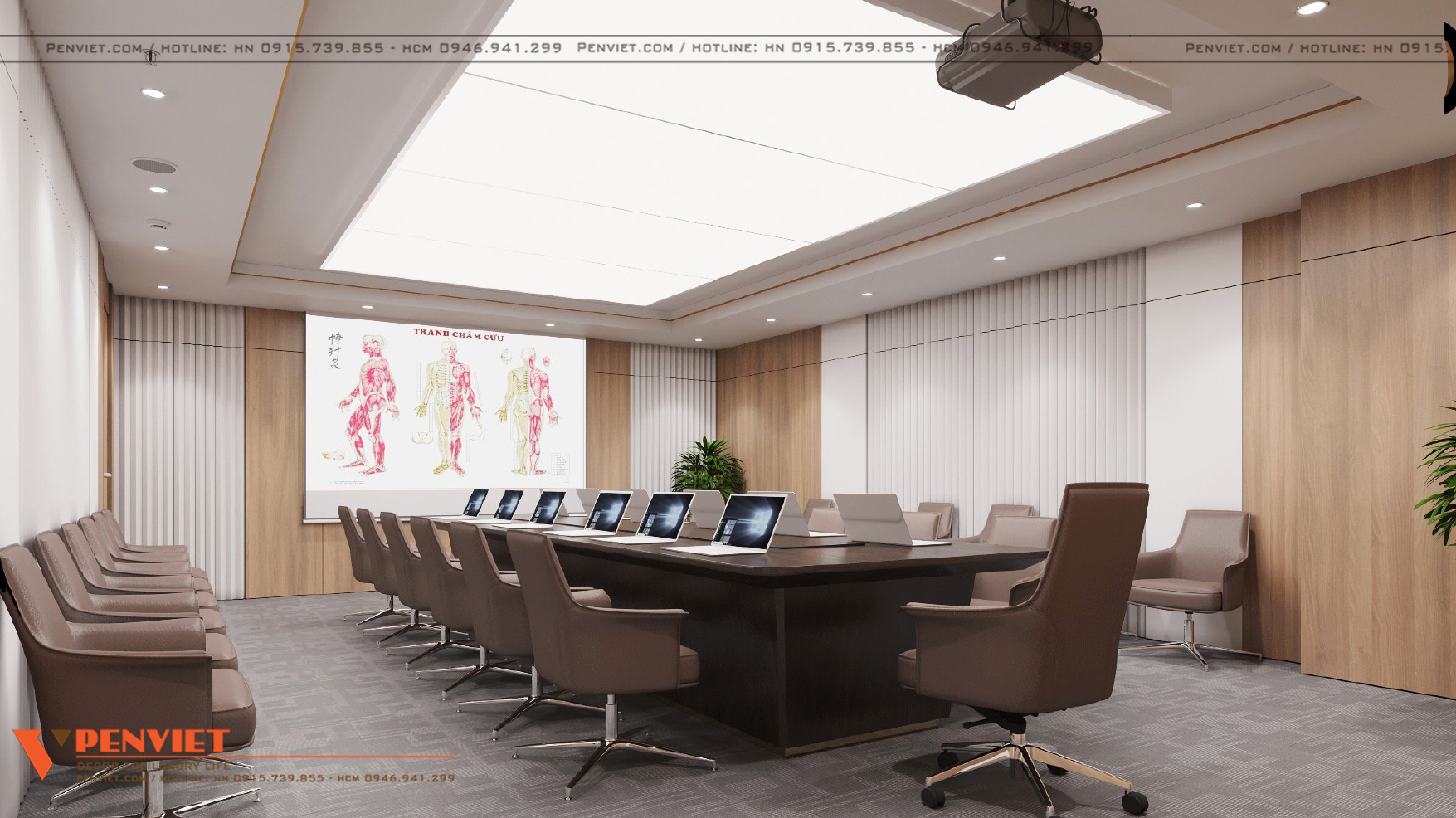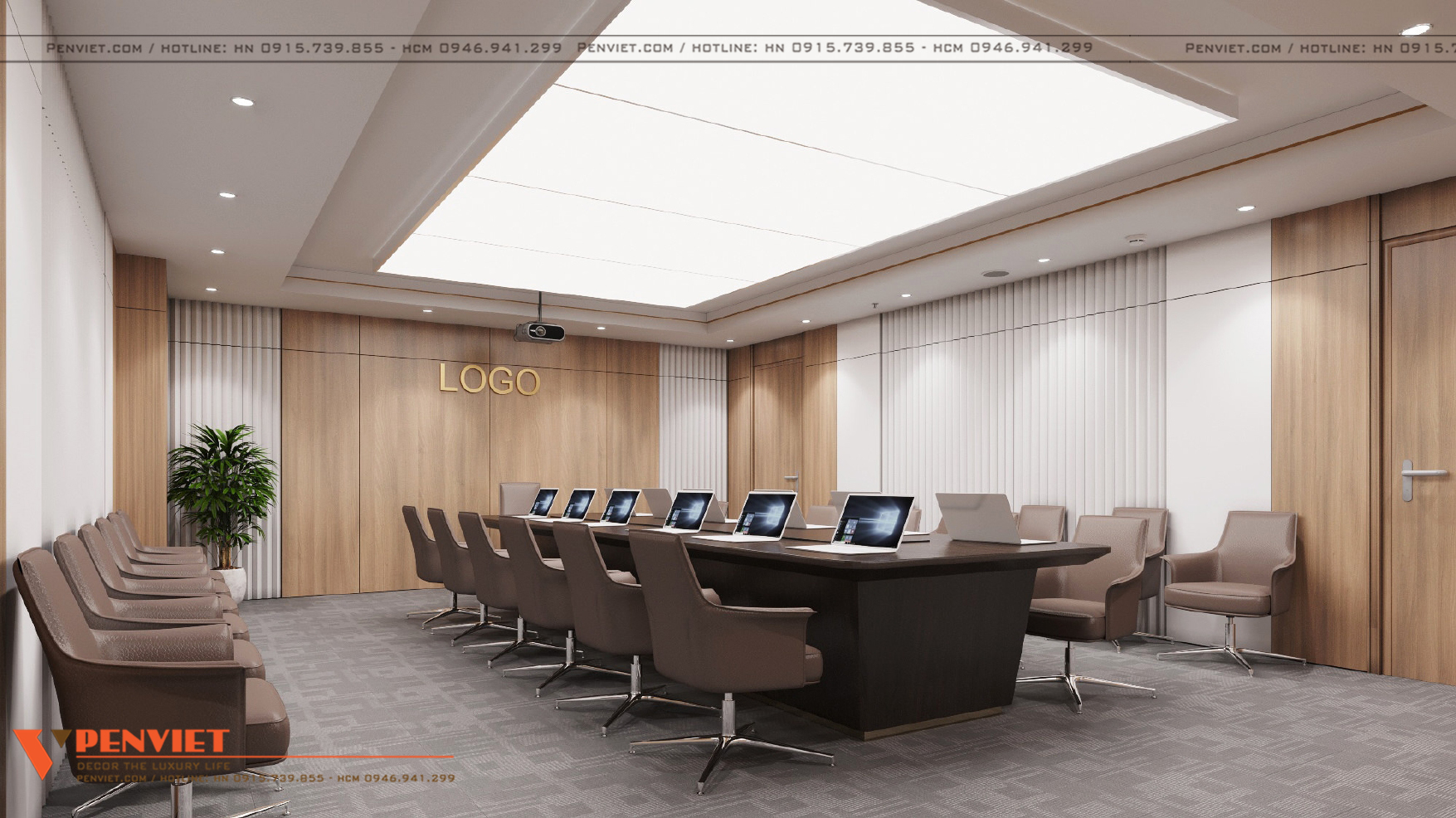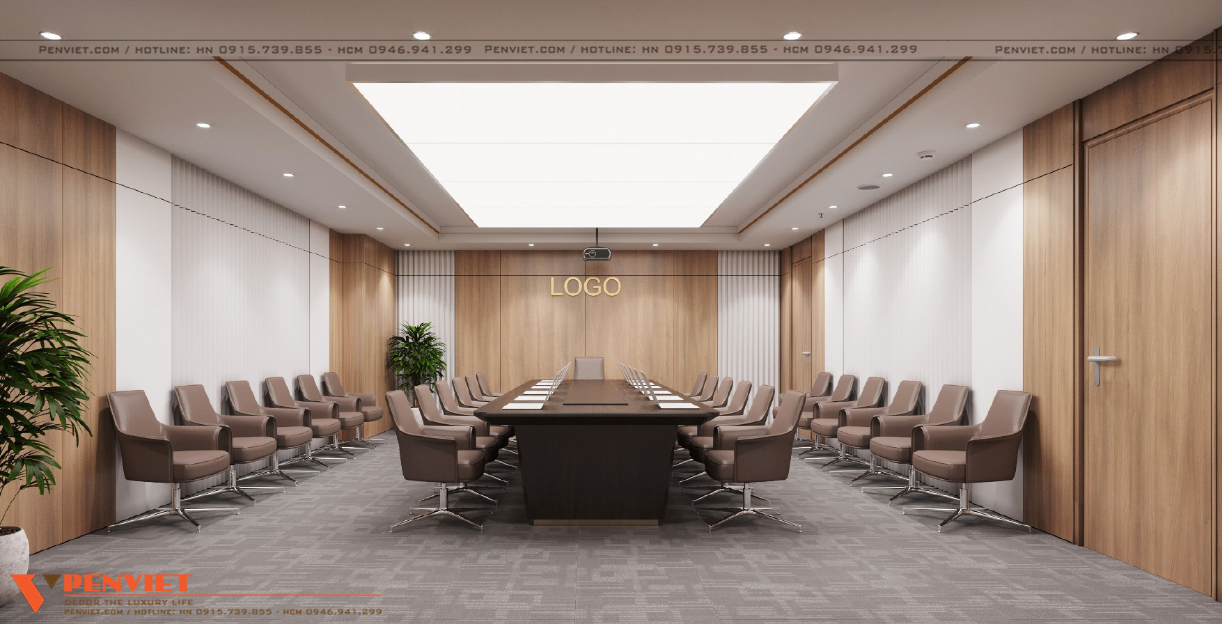 Phòng giao ban được sử dụng tông màu trắng tạo không gian thoáng hơn ,tạo điểm nhấn với đồ nội thất màu nâu gỗ đem lại sự sang trọng hiện đại.