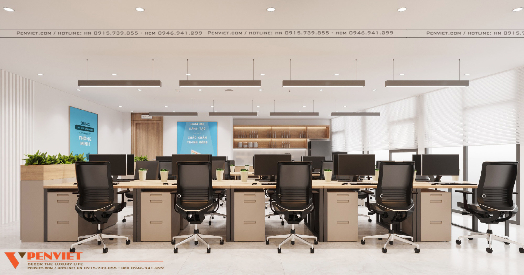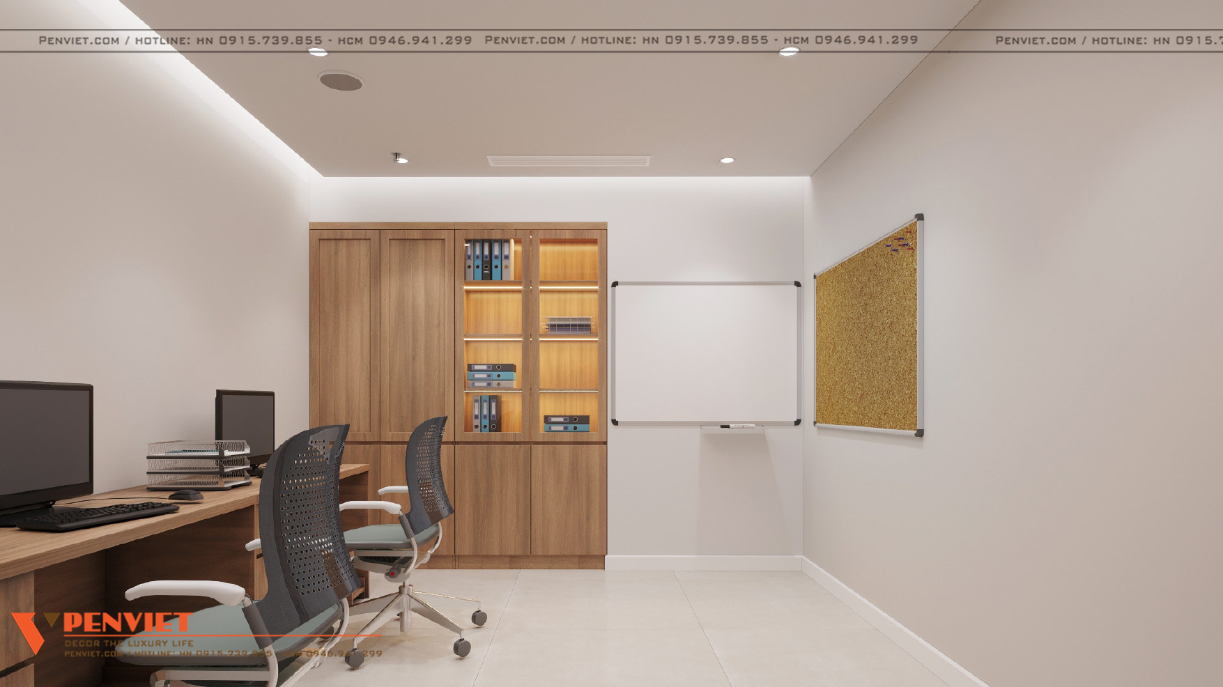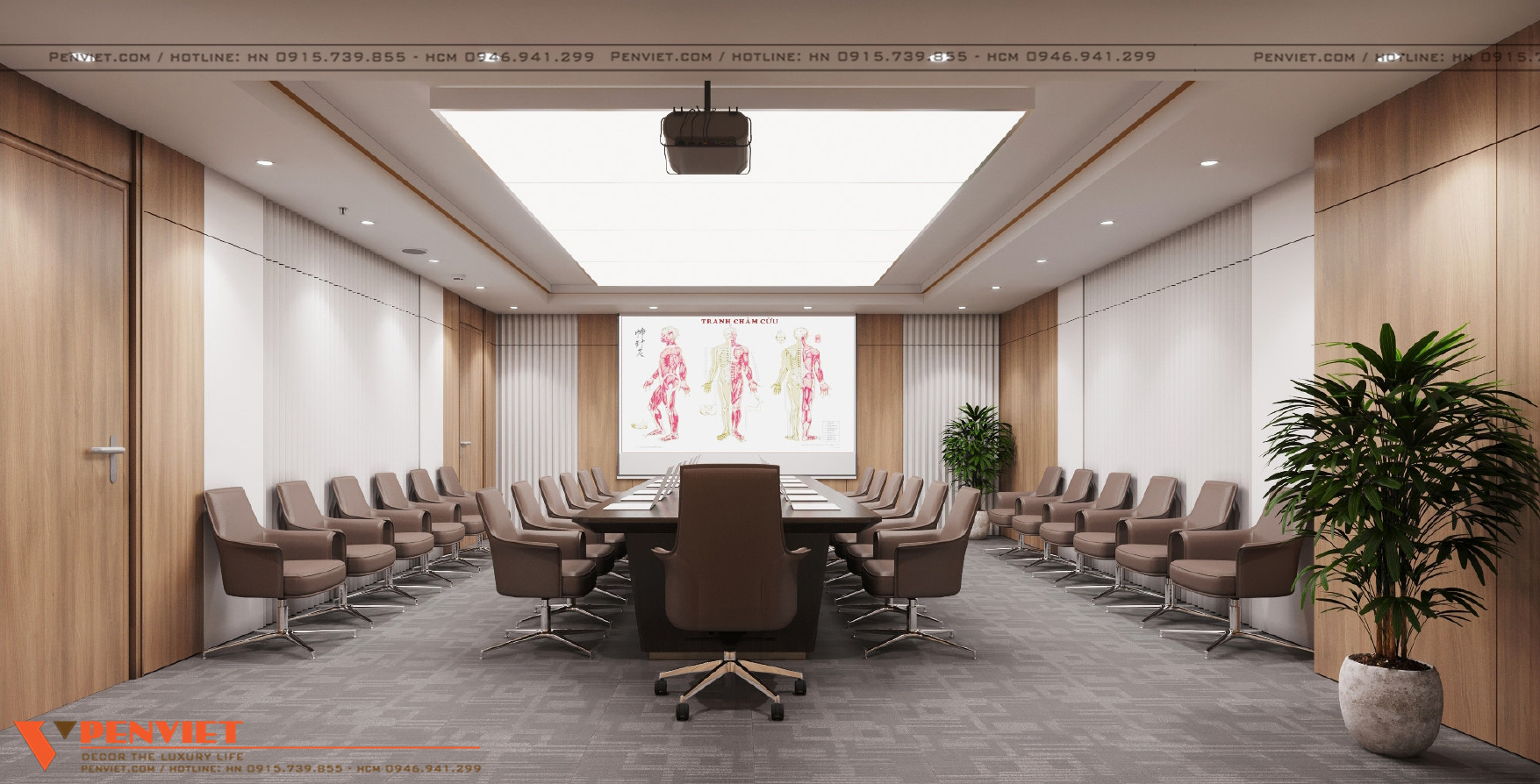 Phòng giao ban được sử dụng tông màu trắng tạo không gian thoáng hơn ,tạo điểm nhấn với đồ nội thất màu nâu gỗ đem lại sự sang trọng hiện đại.