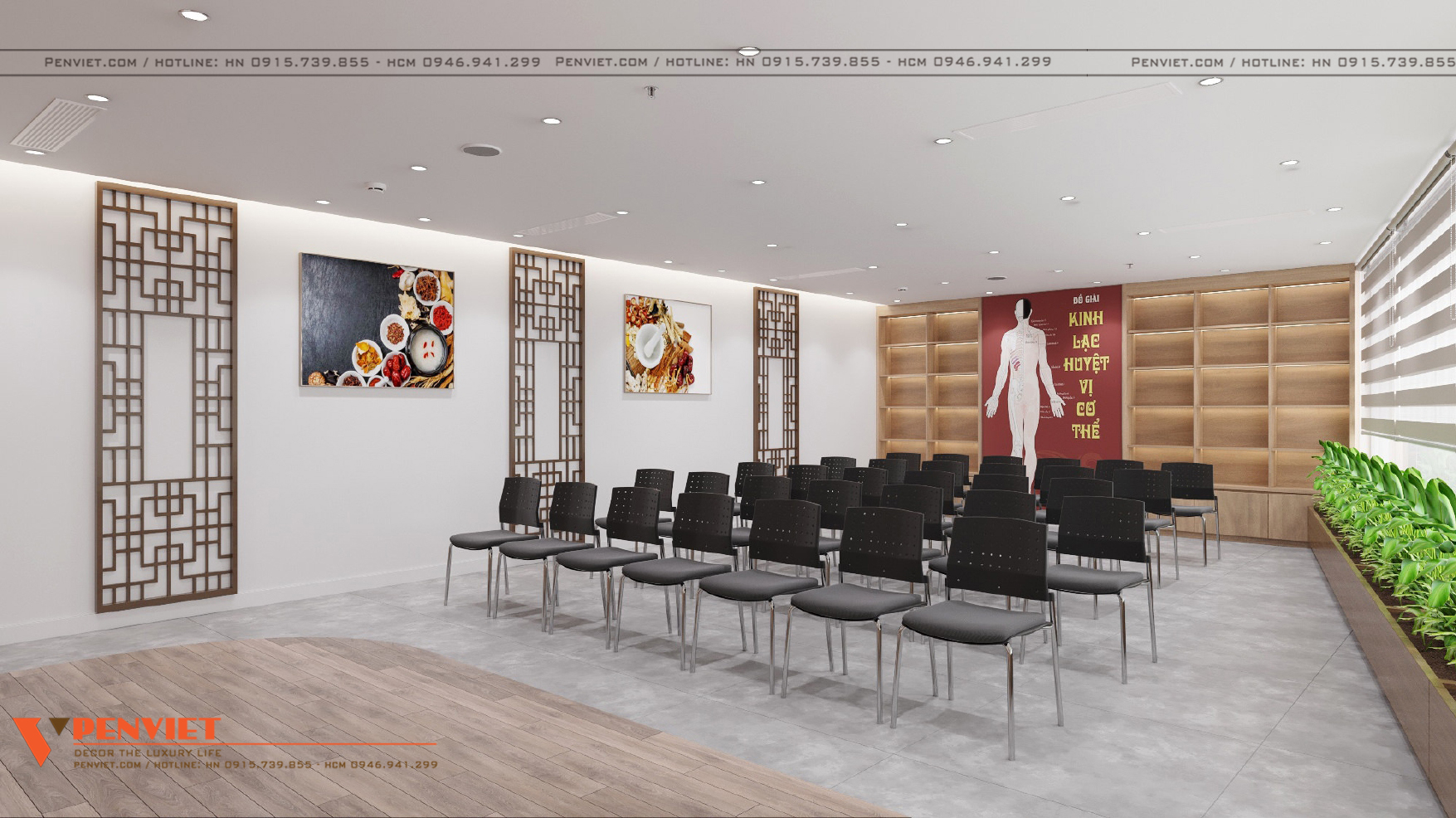 Phòng giới thiệu sản phẩm được thiết kế trong diện tích 32,6m2 với sức chứa hơn 30 người. Phòng giới thiệu được thiết kế với phong cách hiện đại với hệ ghế ngồi đơn sắp xếp gọn gàng và khu vực bục phát biểu. Để tránh sự nhàm chán trong không gian, chúng tôi cũng setup các bức tranh với hình ảnh minh họa cho dịch vụ phòng khám và những vách ốp gỗ độc đáo.
