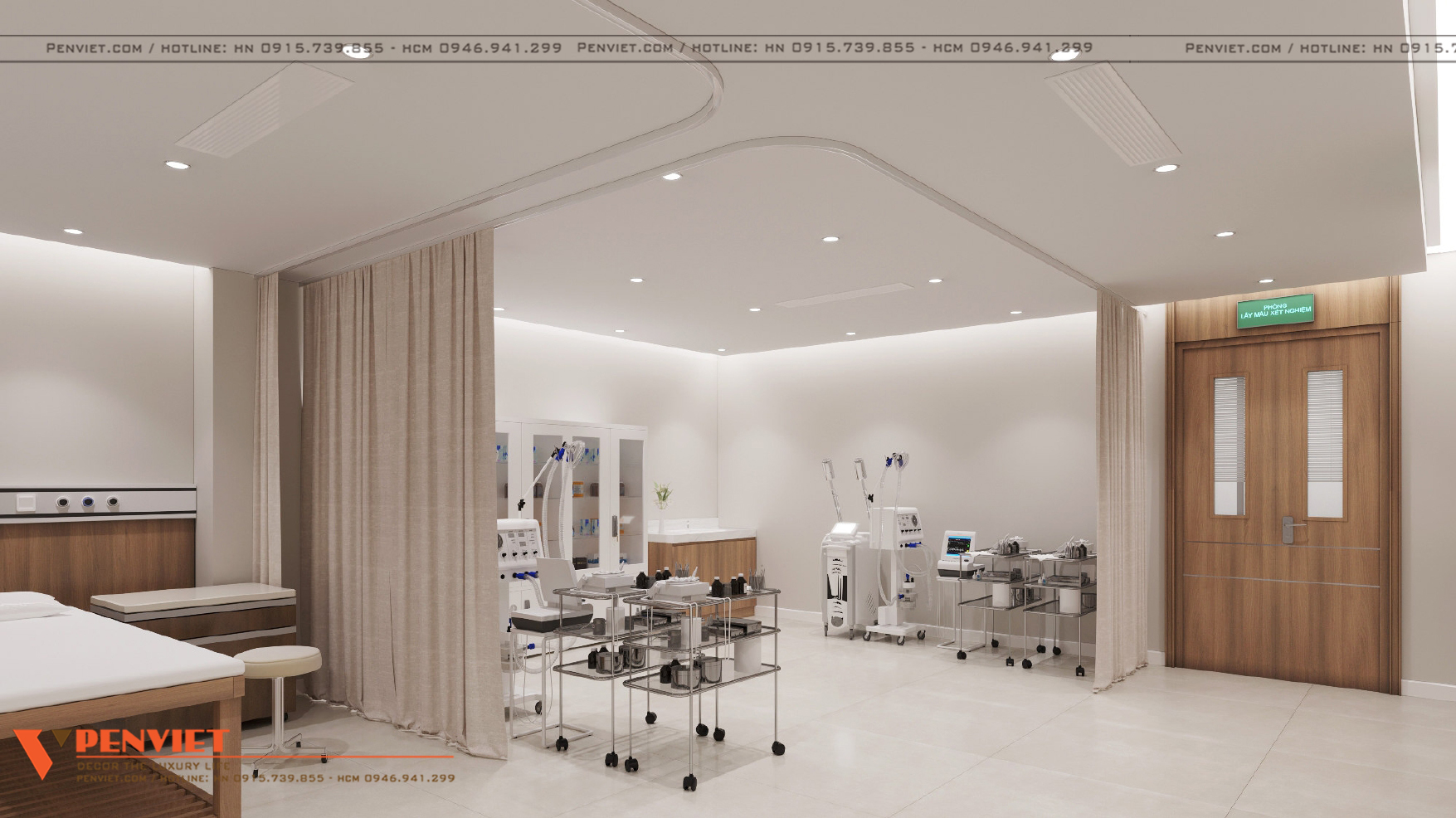 Thiết kế bệnh viện tổ hợp y học cổ truyền và chăm sóc sức khỏe chất lượng cao luôn chú trọng tạo nên được không gian sạch sẽ, bố trí gọn gàng. Ở phòng lấy mẫu xét nghiệm được bố cục đơn giản với bàn lấy mẫu kết hợp giữa chất liệu gỗ và kính cường lực. Thiết kế kiểu dáng đơn giản nhưng phát huy tối đa công năng sử dụng.