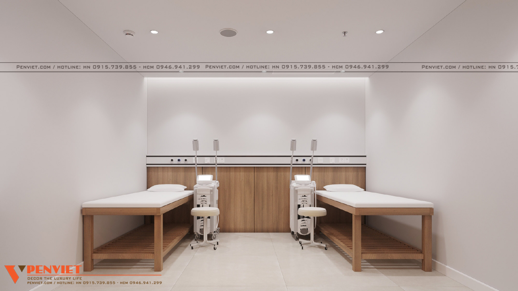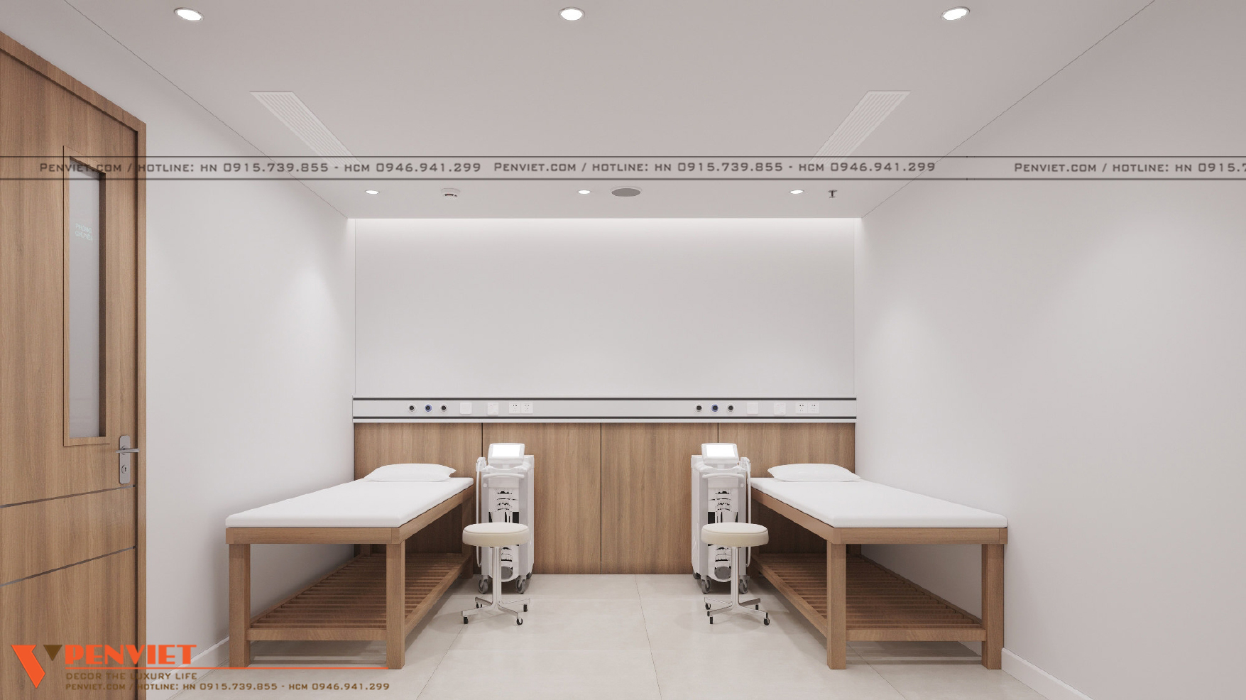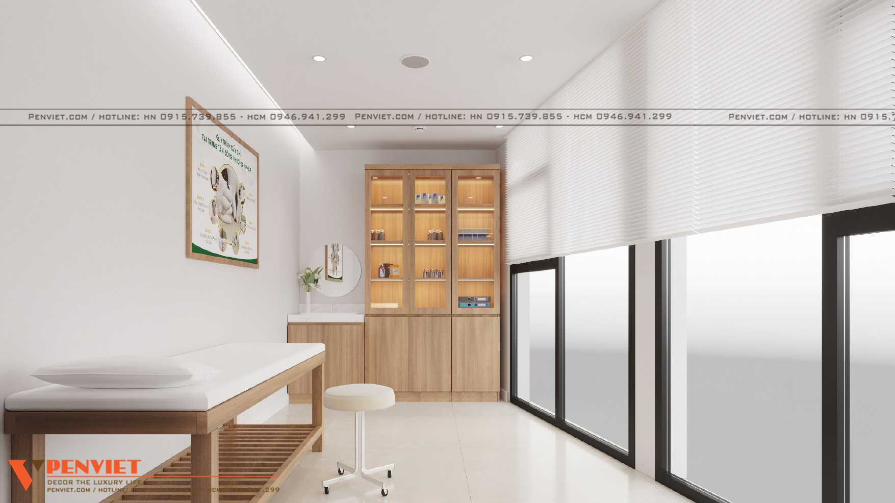 Penviet sử dụng giường trị liệu và ghế ngồi cho nhân viên khung gỗ kết hợp đệm mang lại sự thoải mái cho người dùng. Ngăn cách giữa các giường trị liệu, chúng tôi sử dụng hệ rèm sáng vừa mang đến sự riêng tư vừa tạo nên hình ảnh chuyên nghiệp cho phòng điều trị.
