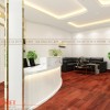 Bước vào cửa, khu vực đầu tiên gây ấn tượng với khách hàng chính là khu vực lễ tân và ghế sofa chờ. Bộ bàn ghế sofa sang trọng được bố trí cố định sát tường, tiết kiệm lối đi lại. Không gian nổi bật với gam màu trắng kết hợp màu vàng của nẹp alu vàng gương, sàn nhà bằng gỗ màu nâu đỏ tạo không gian sang trọng và vô cùng đẳng cấp.