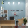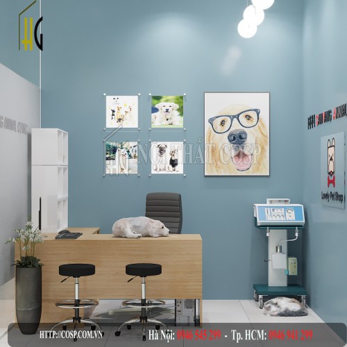 Với chức năng như nhau nhưng ở mỗi gian lại có những chi tiết trang trí khác nhau. Ở gian phụ sẽ có những khung ảnh các bé thú cưng và logo của bệnh viện rất đáng yêu được dùng để tạo nên không khí gần gũi cho bệnh viện và hòa hợp với phong cách chung.