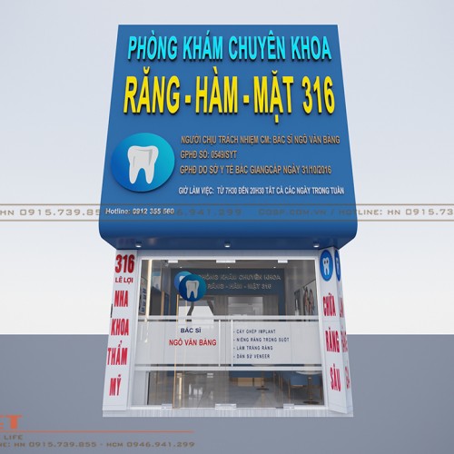 Đặc biệt, biển hiệu phòng khám được thiết kế có tên thương hiệu “PHÒNG KHÁM CHUYÊN KHOA RĂNG HÀM MẶT 316” kích thước lớn và bắt mắt. Sử dụng hệ đèn rọi có độ chiếu sáng tốt Giúp biển hiệu luôn nổi bật giữa phố xá ngay cả ban đêm.