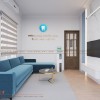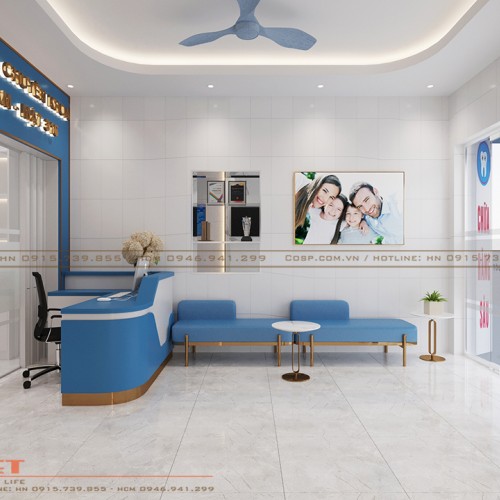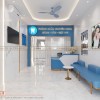 Ngay khi bước vào cửa, bạn sẽ được nhân viên của phòng khám tiếp đón nhiệt tình. Tại đây có setup bộ bàn ghế sofa màu xanh và quầy lễ tân phục vụ khách hàng.
