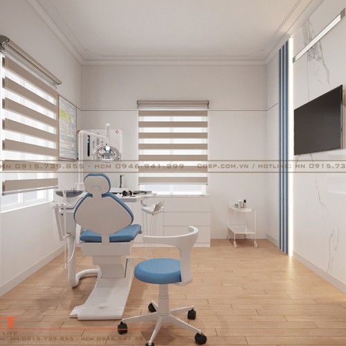 Tiếp đến là không gian nội thất bên trong phòng chuyên sâu răng hàm mặt tại tầng 2 của phòng khám 316. Nhằm đáp ứng yêu cầu riêng về dịch vụ, tại đây chỉ bố trí 1 ghế răng duy nhất với đầy đủ các máy móc đi kèm. Mọi yếu tố trang trí khác đều được tối giản hết mức tạo sự chuyên nghiệp và giúp không gian thêm rộng mở.