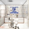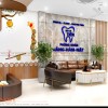 Phía sau bàn ghế là tấm ốp PVC vân đá có bộ chữ logo và tên thương hiệu bằng chân fomex mặt alu in UV. Logo màu xanh nổi bật trên nền đá giúp khách hàng ghi nhớ kỹ hơn về thương hiệu phòng khám.