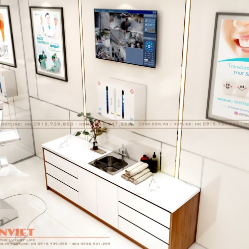 Trong phòng implant cũng được PenViet bố trí vách logo tương đồng nơi phòng tiếp khách. Sự đồng nhất về thiết kế tạo nên dấu ấn mạnh cho khách hàng về thương hiệu phòng khám nha bác sĩ Tiến. Tại đây cũng có tủ đựng trang thiết bị, dụng cụ phục vụ công việc điều trị nha khoa, tạo sự thuận tiện cho y bác sĩ làm việc.