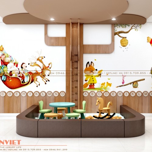 Bước chân vào phòng khám phía bên trái cửa ra vào là khu vui chơi dành cho trẻ em. Ghế chờ bao quanh khu vui chơi làm từ khung gỗ tự nhiên kết hợp gỗ MDF bọc da tạo sự thoải mái cho phụ huynh khi ngồi chơi cùng trẻ.