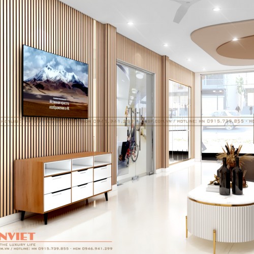 Đối diện khu vực ghế ngồi là tủ trà bánh và tivi để phục vụ khách hàng được chu đáo nhất. Toàn bộ bức tường được ốp thanh lam nhựa plywood ấn tượng tạo sự mới mẻ cho phòng khám.