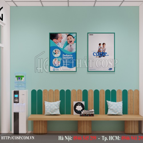 Ngoài ra để tránh sự nhạt nhòa và nhàm chán, chúng tôi sử dụng những hệ nội thất trang trí khác như cây xanh, tranh ảnh backlit khiến phòng khám trở nên phong phú và bắt mắt hơn.