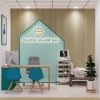 Ngay tại không gian khám bệnh chính, mảng tường được thiết kế với gỗ ghép thanh kết hợp giữa hai màu sắc nâu và xanh blue tạo nên sự đặc biệt và độc đáo khiến trẻ nhỏ thích thú.