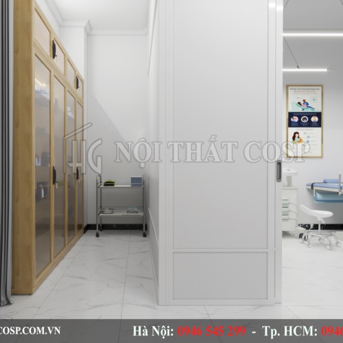 Đến với không gian chính của phòng khám, chúng tôi lựa chọn thiết kế cửa ngăn cách để tạo không gian riêng tư đối với nơi làm việc của bác sĩ.