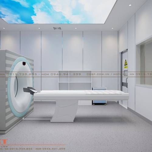 Tại phòng chụp cộng hưởng từ của trung tâm cơ xương khớp phục hồi chức năng quân đội, PenViet thiết kế nội thất hiện đại. Các mẫu tủ kệ, tap đựng đồ dùng hay giường nằm đều có gam màu tươi trẻ, tạo sự lạc quan cho bệnh nhân.