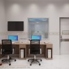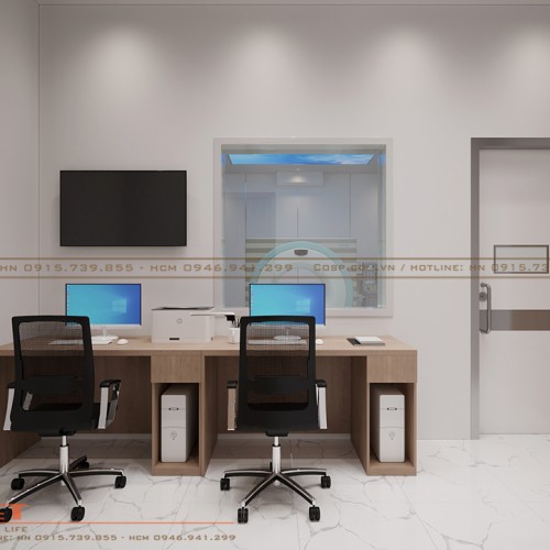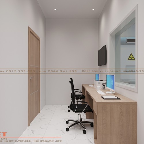 Bàn làm việc thiết kế đơn giản nhưng đảm bảo đủ diện tích để 2 người sử dụng. Phía trước là tấm kính cường lực trong suốt để y bác sĩ thuận tiện theo dõi bệnh nhân bên trong phòng chụp cộng hưởng từ.