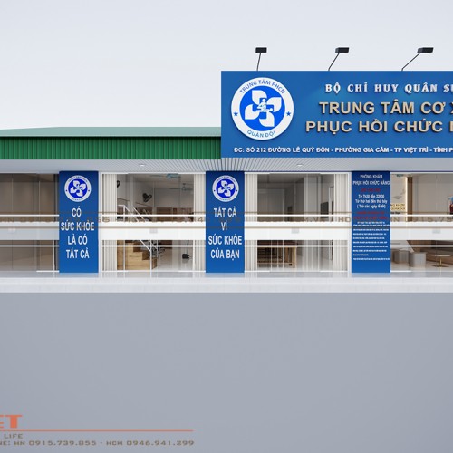 Trung tâm cơ xương khớp phục hồi chức năng quân đội tại Phú Thọ của anh Đạt có ưu thế mặt tiền rộng rãi nên thuận tiện bố trí nhiều biển bảng quảng cáo. Đây là cách để quảng bá thương hiệu đến nhiều đối tượng khách hàng.
